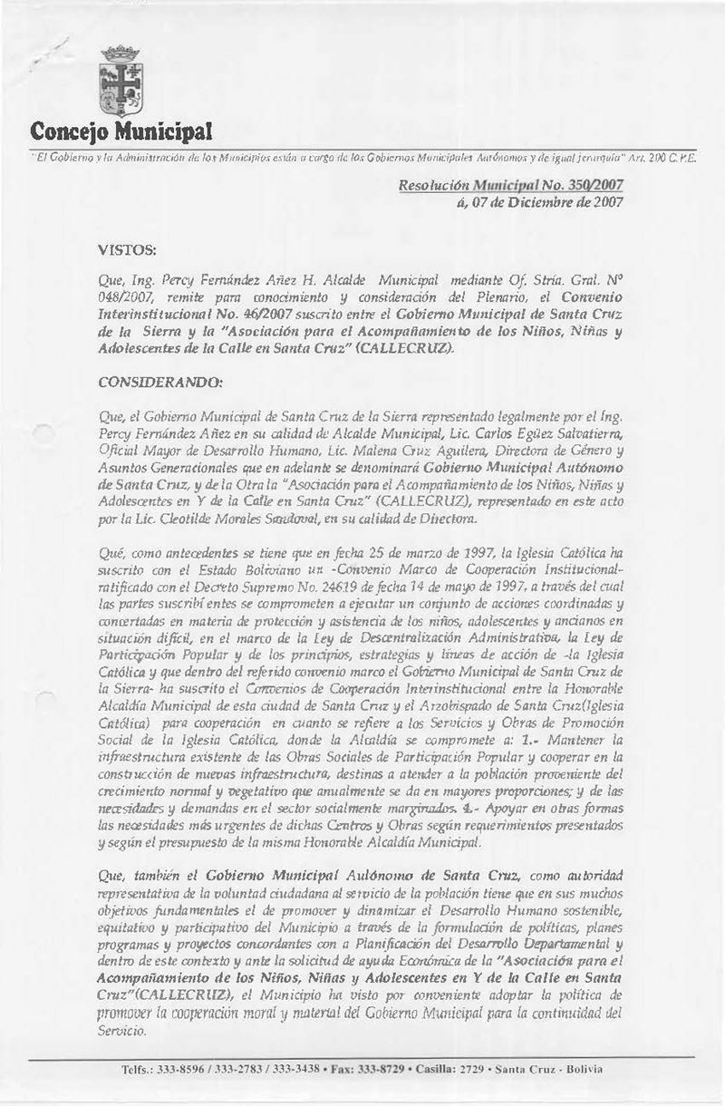 Aprueba el Convenio Interinstitucional Nº 46/2007, para la ejecución del proyecto “Capacitación de niños, niñas y adolescentes trabajadores en la calle y mercados de la ciudad de Santa Cruz de la Sierra”suscrito con la “Asociación para el Acompañamiento de los Niños, Niñas y Adolescentes de la Calle en Santa Cruz” (CALLECRUZ), por el monto total del Convenio de Bs. 130.000.00 (Ciento Treinta mil 00/100 Bolivianos).
