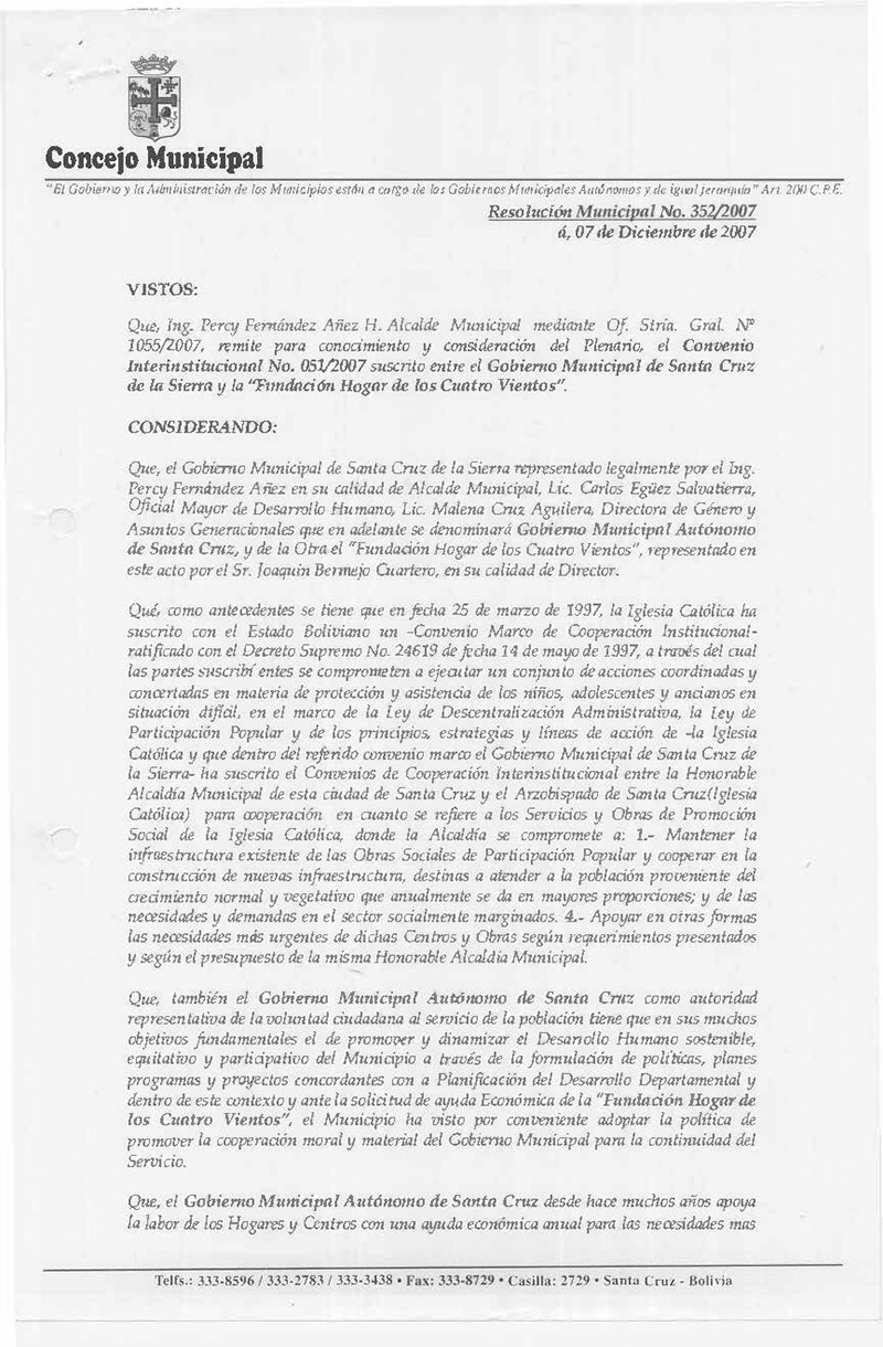 Aprueba el Convenio Interinstitucional Nº 51/2007, suscrito con la “Fundación Hogar de los Cuatro Vientos”, por el monto total de Bs. 15.000.00 (Quince mil 00/100 Bolivianos ).