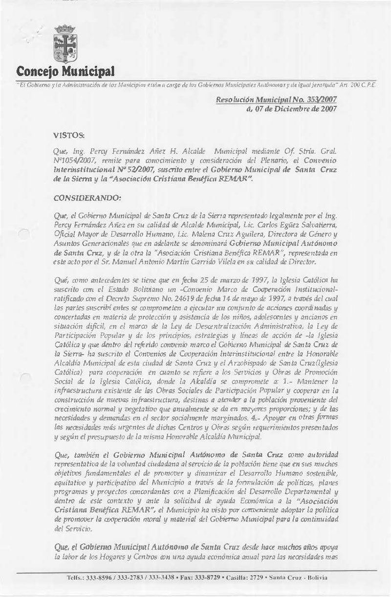 Aprueba el Convenio Interinstitucional Nº 52/2007, suscrito con la “Asociación Cristiana Benéfica REMAR”, por el monto total Bs. 10.000.00 (Diez mil 00/100 Bolivianos).