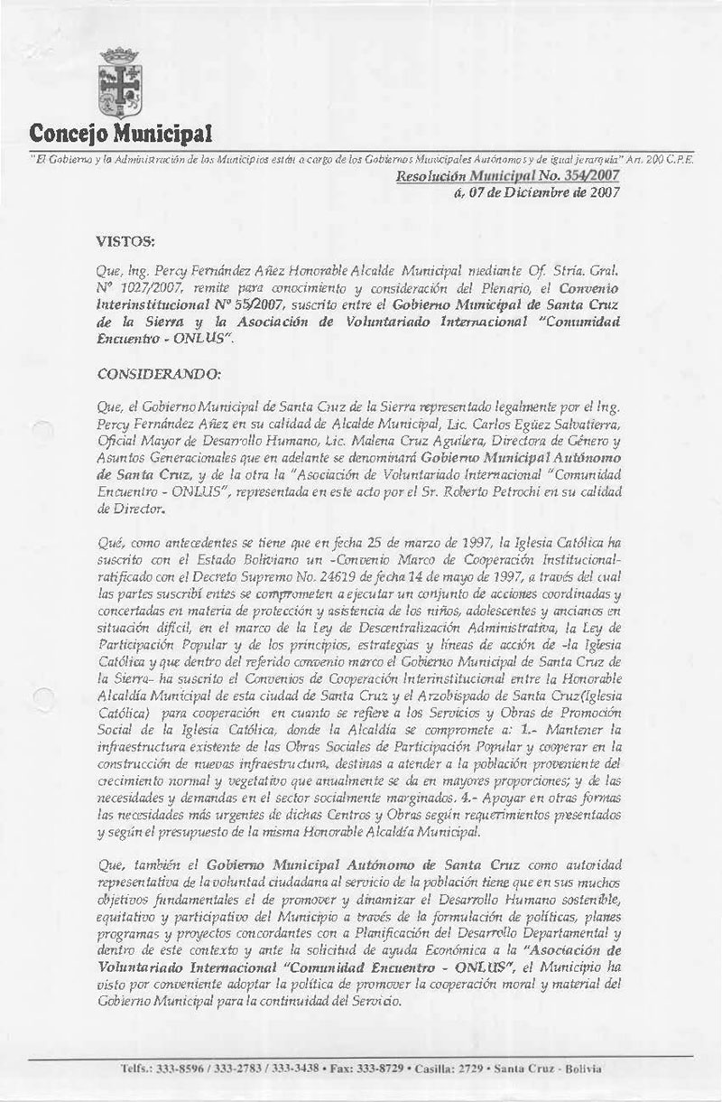 Aprueba el Convenio Interinstitucional Nº 55/2007, suscrito con la “Asociación de Voluntariado Internacional “Comunidad Encuentro - ONLUS”, por el monto total de 431.000.00 (Cuatrocientos Treinta y Un mil 00/100 Bolivianos).
