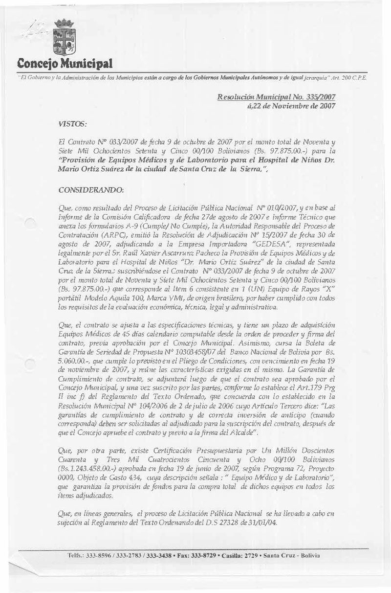 Aprueba el Contrato N° 033/2007, para la “Provisión de Equipos Médicos y de Laboratorio para el Hospital de Niños Dr. Mario Ortiz Suárez de la ciudad de Santa Cruz de la Sierra”, por el monto total de Bs. 97.875.00 (Noventa y Siete Mil Ochocientos Setenta y Cinco 00/100 Bolivianos), a suscribirse con la empresa importadora “GEDESA”.