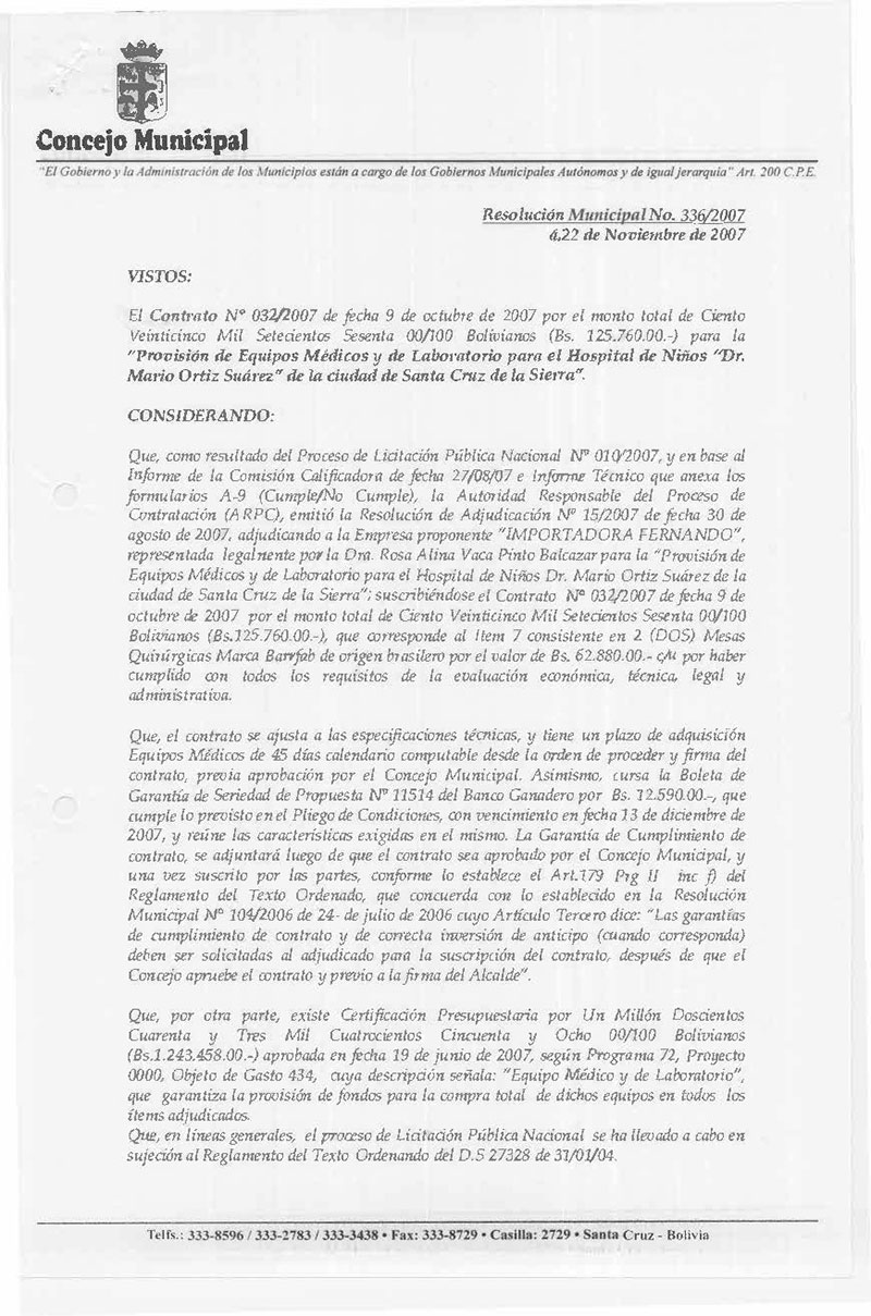 Aprueba el Contrato N° 032/2007, para la “Provisión de Equipos Médicos y de Laboratorio para el Hospital de Niños Dr. Mario Ortiz Suárez de la ciudad de Santa Cruz de la Sierra”,por el monto total de Bs. 125.760.00 (Ciento Veinticinco Mil Setecientos Sesenta 00/100 Bolivianos), adjudicado a la empresa “IMPORTADORA FERNANDO”.