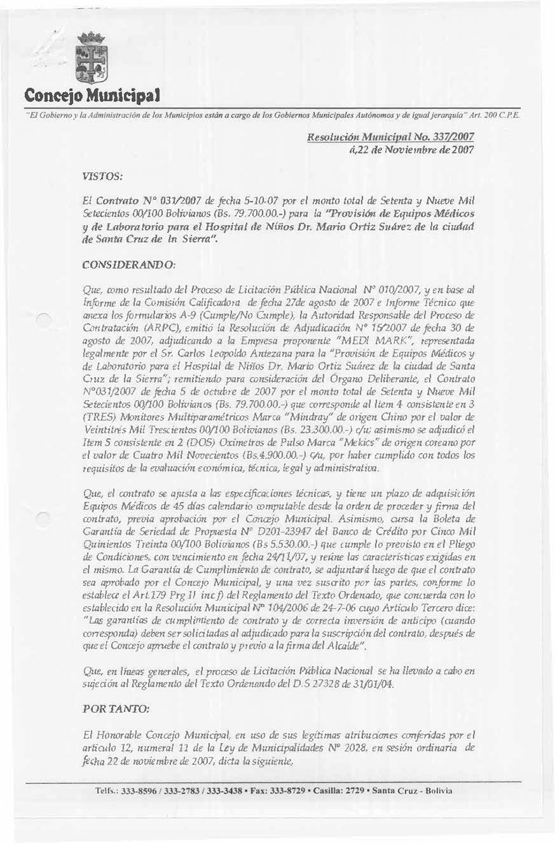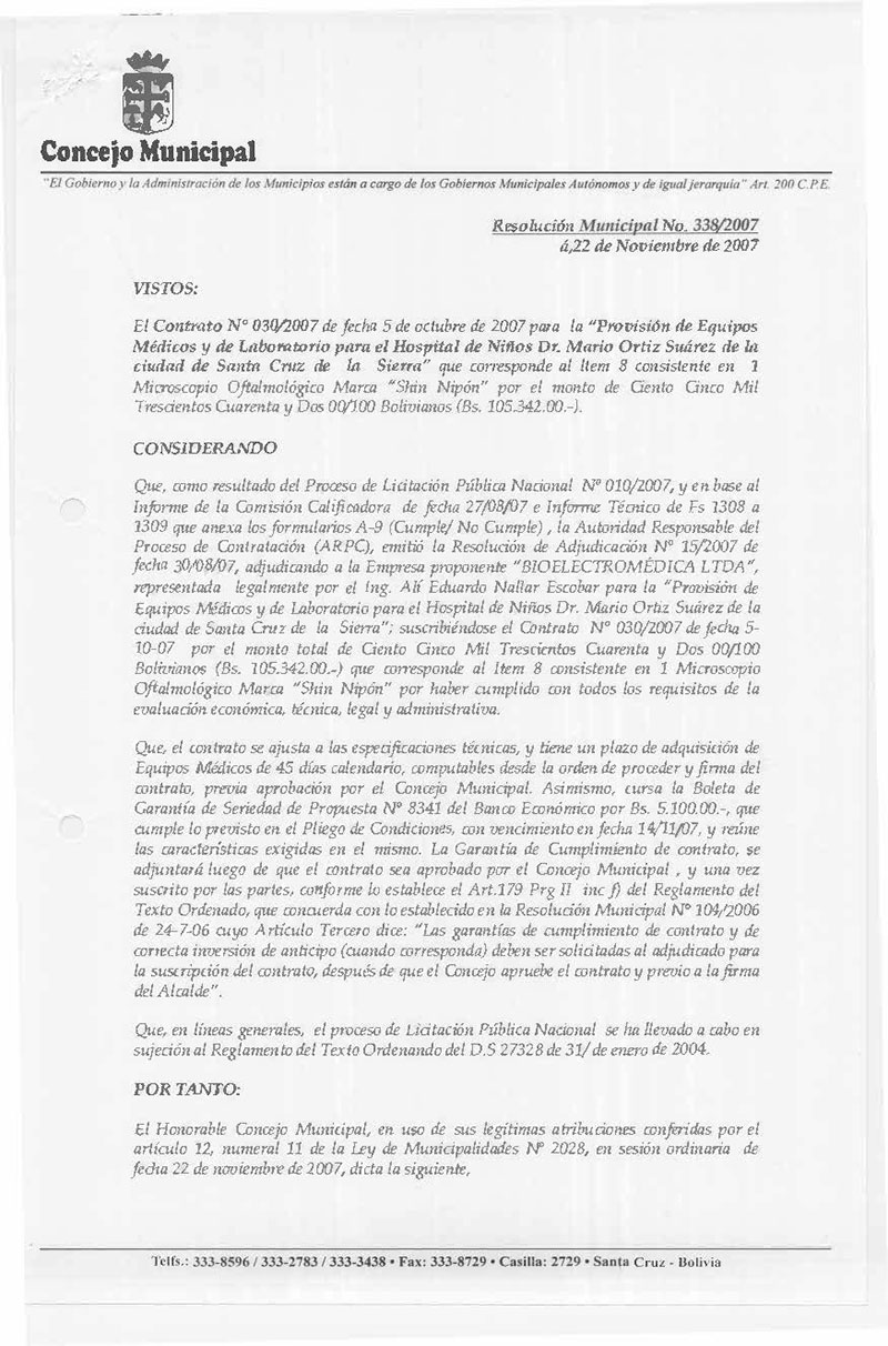 Aprueba el Contrato N° 030/2007, para la “Provisión de Equipos Médicos y de Laboratorio para el Hospital de Niños Dr. Mario Ortiz Suárez de la ciudad de Santa Cruz de la Sierra” por el monto de Bs. 105.342.00 (Ciento Cinco Mil Trescientos Cuarenta y Dos 00/100 Bolivianos) a suscribirse con la Empresa “BIOELECTROMÉDICA LTDA”.