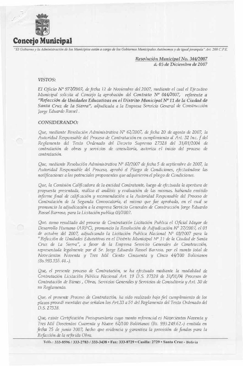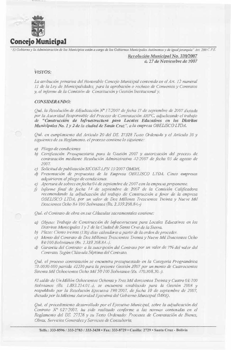 Aprueba el Contrato N° 027/2007, para la ejecución del Trabajo de “Construcción de Infraestructura de Locales Educativos en los Distritos Municipales Nº 1 y 2 de la ciudad de Santa Cruz de la Sierra”, suscrito con la Empresa OBELISCO LTDA, por un monto de Bs. 2.339.208.84 (Dos Millones Trescientos Treinta y Nueve Mil Doscientos Ocho 84/100 Bolivianos).