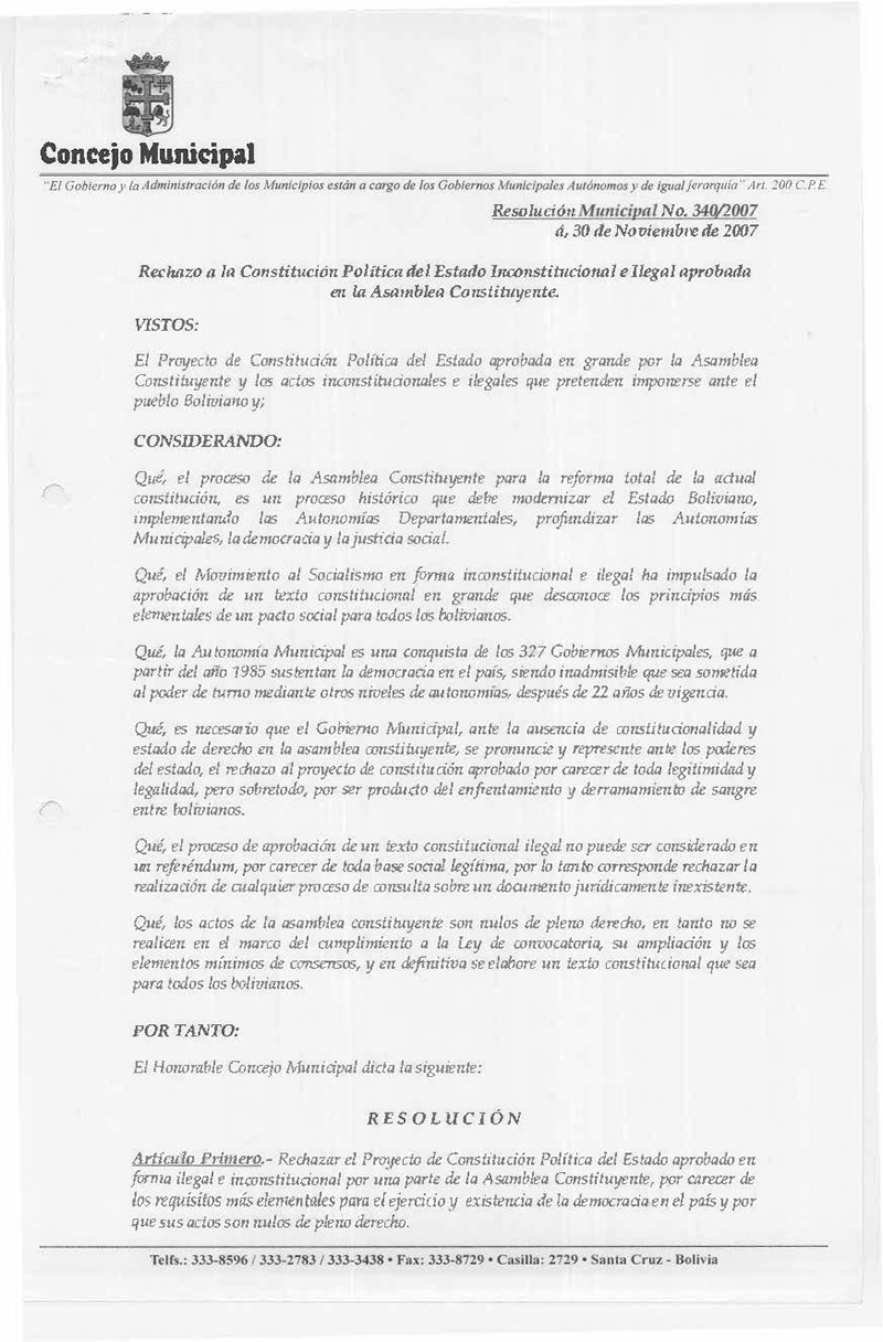 Rechazar el Proyecto de Constitución Política del Estado aprobado en forma ilegal e inconstitucional por una parte de la Asamblea Constituyente, por carecer de los requisitos más elementales para el ejercicio y existencia de la democracia en el país y por que sus actos son nulos de pleno derecho.