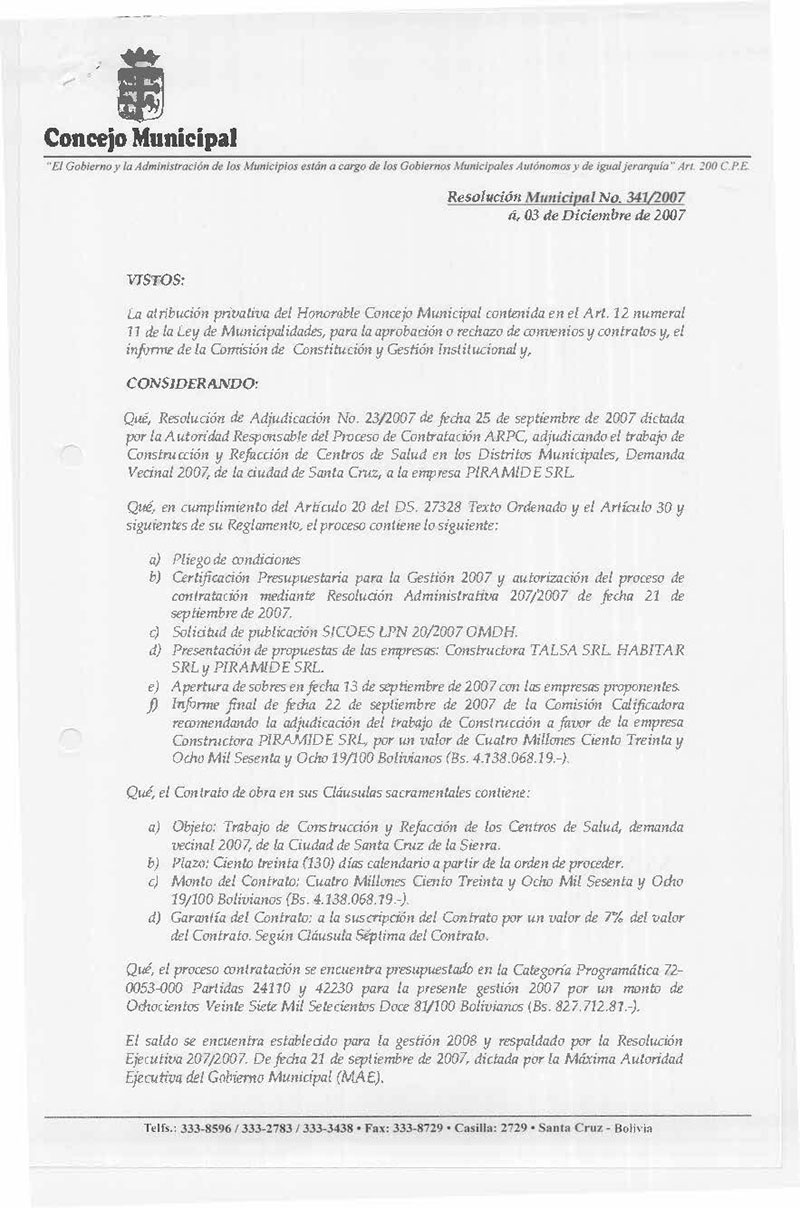 Aprueba el Contrato N° 035/2007, para la ejecución del Trabajo de “Construcción y Refacción de los Centros de Salud en los Distritos Municipales, Demanda Vecinal 2007, de la Ciudad de Santa Cruz de la Sierra” suscrito con la Empresa Constructora PIRAMIDE SRL por un monto de Bs. 4.138.068.19 (Cuatro Millones Ciento Treinta y Ocho Mil Sesenta y Ocho 19/100 Bolivianos).