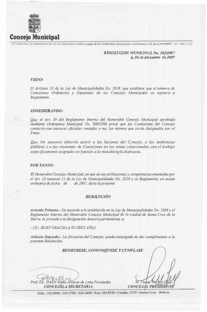 Aprueba la Designación de la Lic. Ruby Graciela Suarez Añez como asesora de la Comisión de Finanzas.