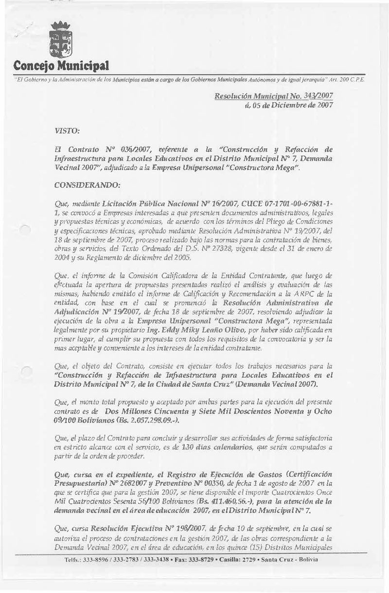 Aprueba el Contrato Nº 036/2007, referente a la “Construcción y Refacción de Infraestructura para Locales Educativos en el Distrito Municipal Nº 7, Demanda Vecinal 2007”, Adjudicado a la Empresa Unipersonal “Constructora Mega”, por el monto total de Bs. 2.057.298,09 (Dos Millones Cincuenta y Siete Mil Doscientos Noventa y Ocho 09/100 Bolivianos).