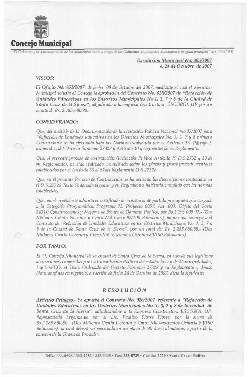 Aprueba el Contrato N° 025/2007, referente a “Refacción de Unidades Educativas en los Distritos Municipales N° 1, 3, 7 y 8 de la ciudad de Santa Cruz de la Sierra”, adjudicándose a la Empresa Constructora ESCOBOL UP, por la suma de Bs. 2.185.680.80.- (Dos Millones Ciento Ochenta y Cinco Mil seiscientos Ochenta 80/100 Bolivianos).
