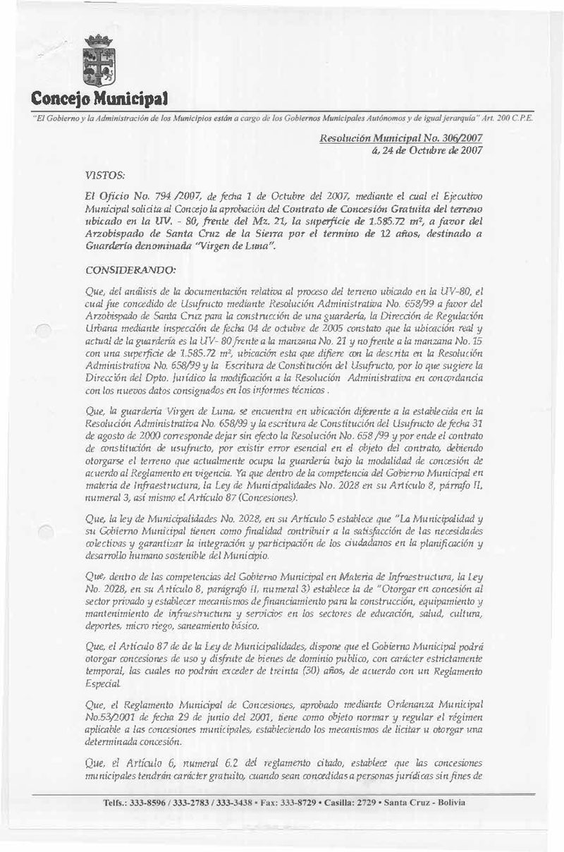 Aprueba el Contrato de Concesión Gratuita y Temporal que comprende la Guardería denominada “Virgen de Luna” por el termino de 12 años, a favor del Arzobispado de Santa Cruz de la Sierra, el terreno ubicado en la U.V.-80 y frente al Mz. 21, con una superficie de 1.585.72 m2, para funcionamiento de Guardería.