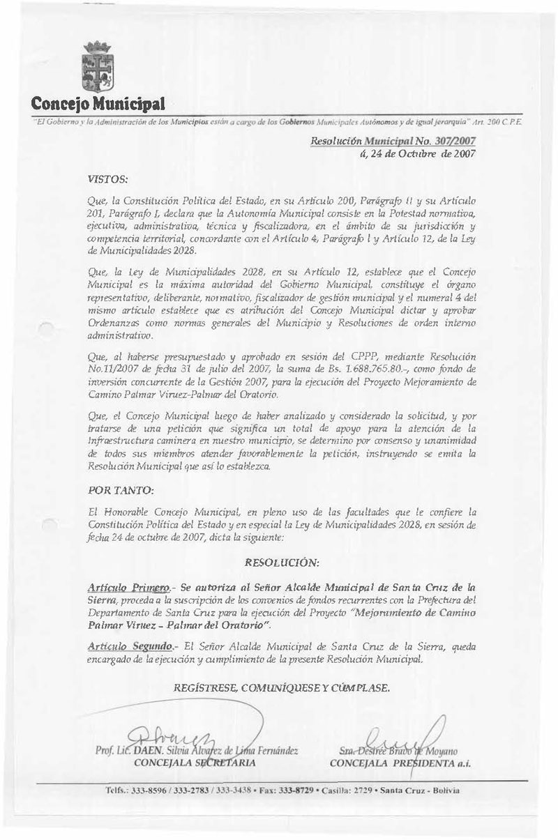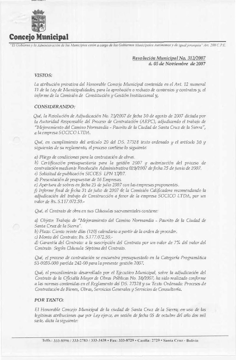 Aprueba el Contrato de la Oficialía Mayor de Obras Públicas N° 38/2007, para la ejecución del Trabajo de “Mejoramiento del Camino Normandia - Paurito de la Ciudad de Santa Cruz de la Sierra”, por un monto de Bs. 5.117.072.50 (Cinco Millones Ciento Diecisiete Mil Setenta y Dos 50/100 Bolivianos),suscrito con la empresa SOCICO LTDA.