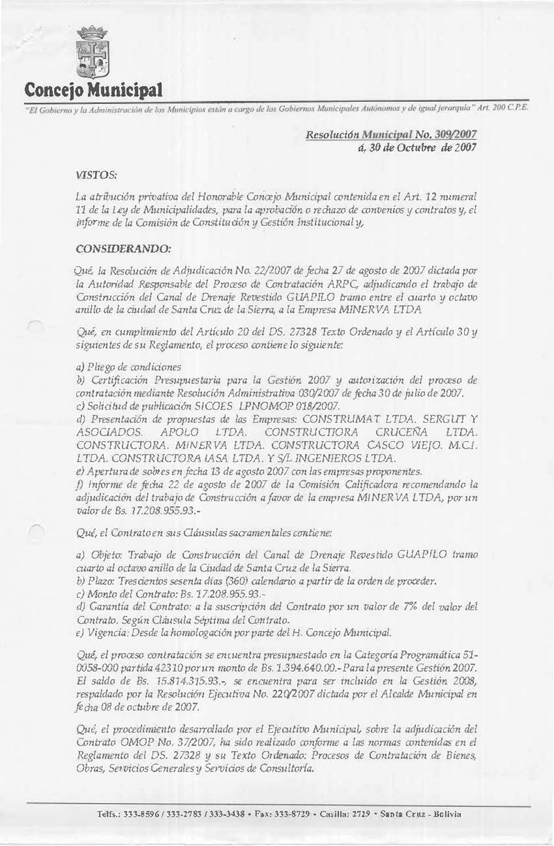 Aprueba el Contrato de la Oficialía Mayor de Obras Públicas N° 37/2007, para la ejecución del Trabajo de “Construcción del Canal de Drenaje Revestido GUAPILO tramo del Cuarto al Octavo anillo, Distrito 6 de la Ciudad de Santa Cruz de la Sierra”, por un monto de Bs. 17.208.955.93.- (Diecisiete Millones Doscientos Ocho Mil Novecientos Cincuenta y Cinco 93/100 Bolivianos), suscrito con la Empresa MINERVA LTDA.