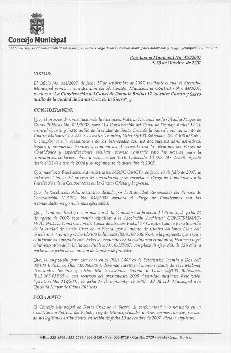 Aprueba el contrato No. 034/2007, referente a “La Construcción del Canal de Drenaje Radial 17 ½, entre Cuarto y Sexto anillo de la ciudad de Santa Cruz de la Sierra”, adjudicado a la Empresa Sociedad Accidental CONSTRUMAT-HOLLWEG, por un monto de Bs. 4.100.638.65 (Cuatro Millones Cien Mil Seiscientos Treinta y Ocho 65/100 Bolivianos).