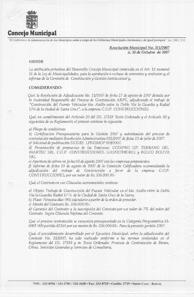 Aprueba el Contrato de la Oficialía Mayor de Obras Públicas N° 33/2007, para la ejecución del Trabajo de “Construcción de un Puente Vehicular ubicado entre la Doble Vía la Guardia y Radial 17 ½ de la ciudad de Santa Cruz de la Sierra”, por un monto de Bs. 336.000.00.- (Trescientos Treinta y Seis Mil Bolivianos),suscrito con la empresa C.OP. CONSTRUCCIONES.