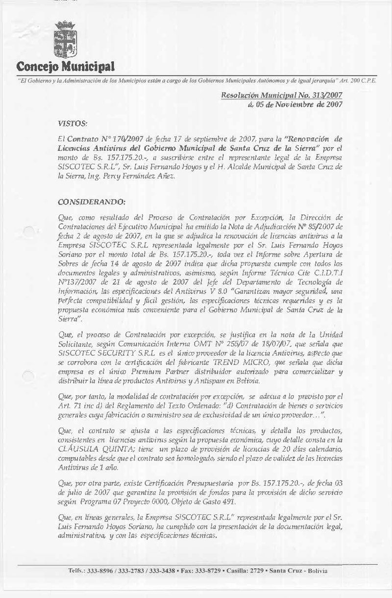 Aprueba el Contrato N° 170/2007, para la “Renovación de Licencias Antivirus del Gobierno Municipal de Santa Cruz de la Sierra” por el monto de Bs. 157.175.20 (Ciento Cincuenta y Siete Mil Ciento Setenta y Cinco 20/100 Bolivianos), a suscribirse con la Empresa SISCOTEC S.R.L”.