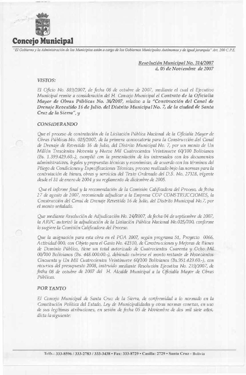 Aprueba el Contrato de la Oficialía Mayor de Obras Públicas N° 36/2007, relativo a la “Construcción del Canal de Drenaje Revestido 16 de Julio, del Distrito Municipal N° 7, de la ciudad de Santa Cruz de la Sierra”, adjudicado a la Empresa COP CONSTRUCCIONES, por un monto total de Bs. 1.399.429.60 (Un Millón Trescientos Noventa y Nueve Mil Cuatrocientos Veintinueve 60/100 Bolivianos).