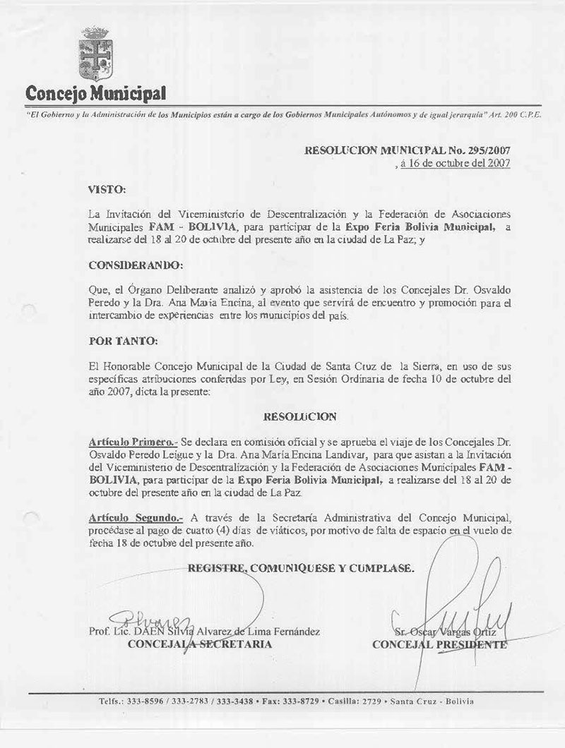 Aprueba el viaje de la Concejal Dra. Ana Maria Encinas y el Concejal Dr. Osvaldo Peredo a la ciudad de La Paz del 17 al 20 de octubre para participar de la Expo Feria Bolivia Municipal - FAM.