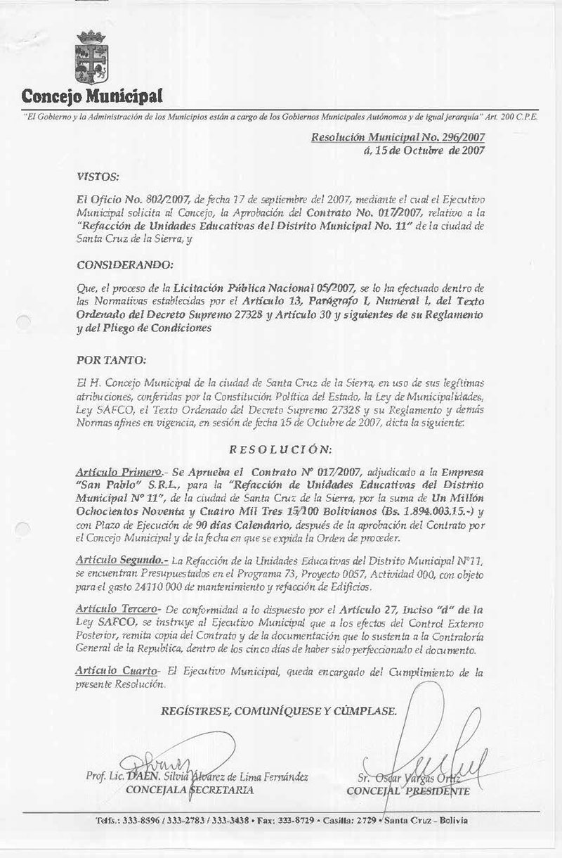 Aprueba el Contrato Nº 017/2007, para la “Refacción de Unidades Educativas del Distrito Municipal Nº 11”, de la ciudad de Santa Cruz de la Sierra, por la suma de Bs. 1.894.003.15 (Un Millón Ochocientos Noventa y Cuatro Mil Tres 15/100 Bolivianos),adjudicado a la Empresa “San Pablo” S.R.L.