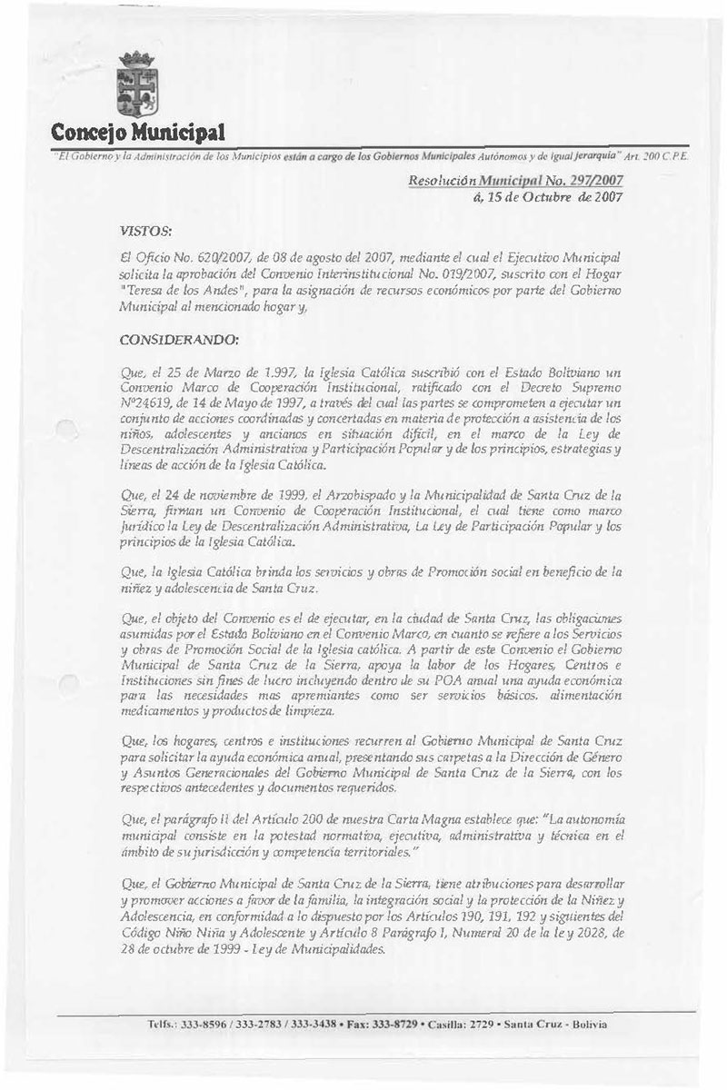 Aprueba el Convenio Interinstitucional Nº 019/2007, suscrito entre el Gobierno Municipal de la Ciudad de Santa cruz de la Sierra y el Hogar "Teresa de los Andes", en beneficio de los Niños y Niñas y Adolescentes del referido Hogar.