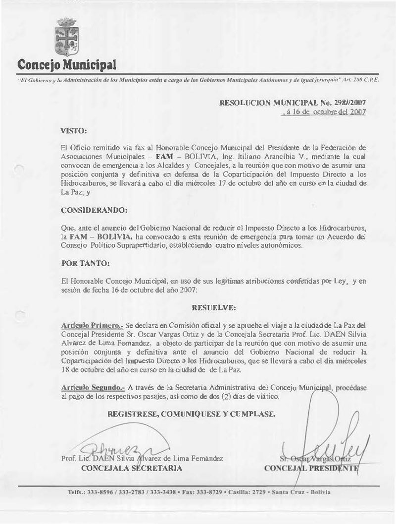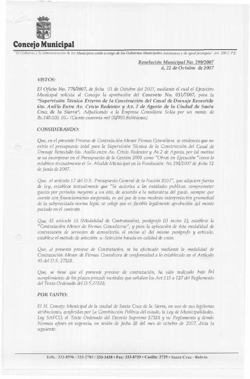 Aprueba el Contrato N° 031/2007, de “Supervisión Técnica Externa de la Construcción del canal de Drenaje Revestido 6° Anillo, entre Av. Cristo Redentor y Av. 2 de Agosto de la ciudad de Santa Cruz de La Sierra”, adjudicada a la Empresa Consultora Sokia, por la suma de Bs. 140.000.00.- (Ciento Cuarenta Mil 00/100 Bolivianos).