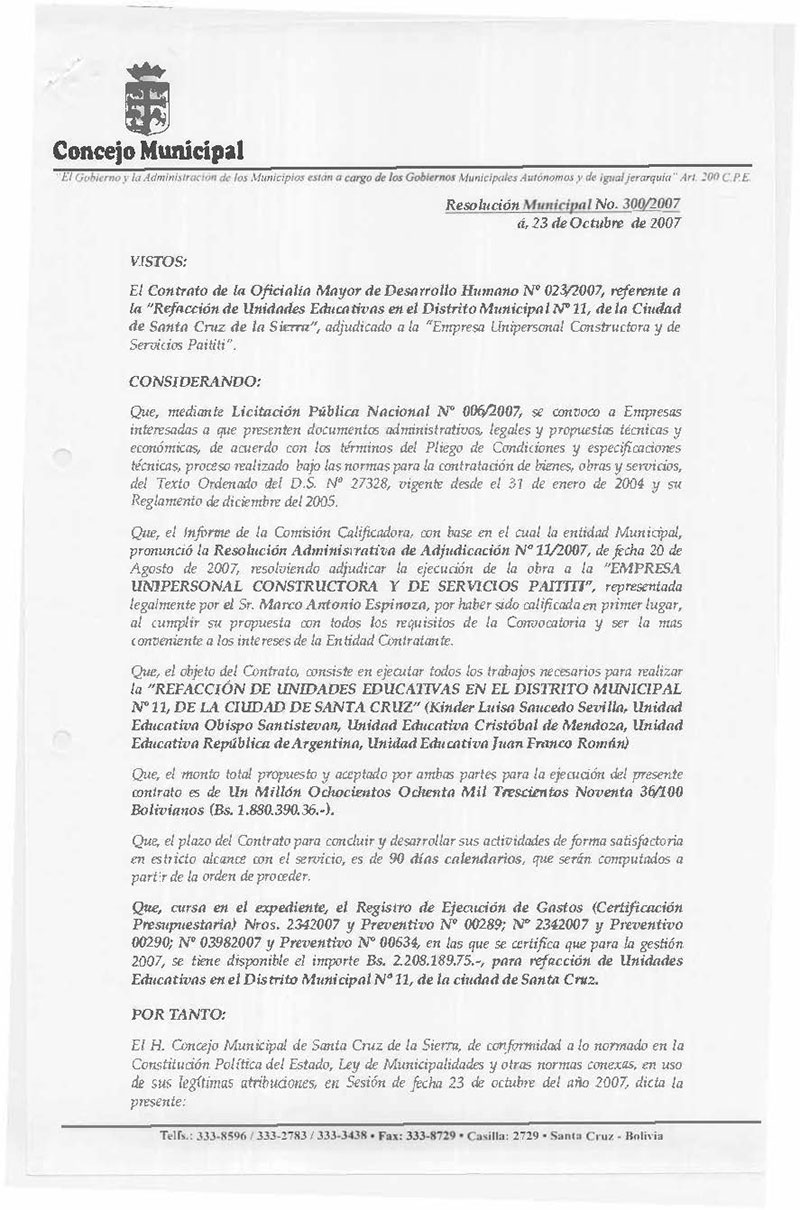 Aprueba el Contrato de la Oficialía Mayor de Desarrollo Humano Nº 023/2007, referente a la “Refacción de Unidades Educativas de el Distrito Municipal Nº 11, de la Ciudad de Santa Cruz”, adjudicado a la “Empresa Unipersonal Constructora y de Servicios Paititi”, por el monto de Bs. 1.880.390.36 (Un Millón Ochocientos Ochenta Mil Trescientos Noventa 36/100 Bolivianos).
