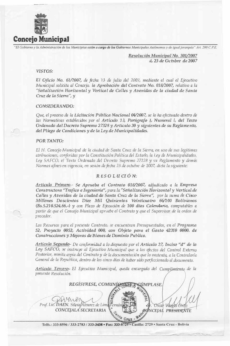 Aprueba el Contrato N° 018/2007, para la “Señalización Horizontal y Vertical de Calles y Avenidas de la ciudad de Santa Cruz de la Sierra”, por la suma de Bs.5.210.524.66 (Cinco Millones Doscientos Diez Mil Quinientos Veinticuatro 66/100 Bolivianos) adjudicado a la Empresa Constructora “Trafico e Ingeniería”.
