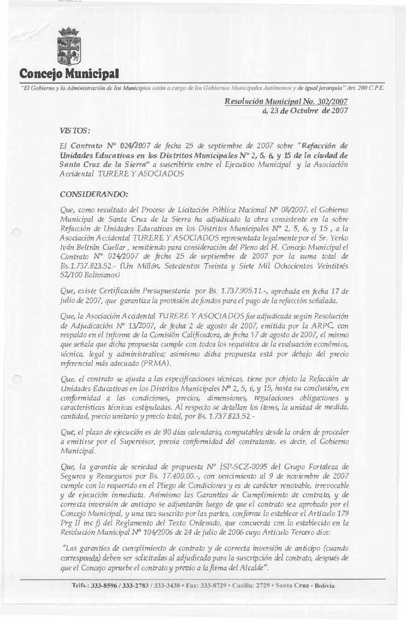 Aprueba el Contrato N° 024/2007, para la “Refacción de las Unidades Educativas en los Distritos Municipales N° 2, 5, 6, y 15” por el monto total de Bs. 1.737.823.52.- (Un Millón Setecientos Treinta y Siete Mil Ochocientos Veintitrés 52/100 Bolivianos) a suscribirse con la Asociación Accidental TURERE Y ASOCIADOS.