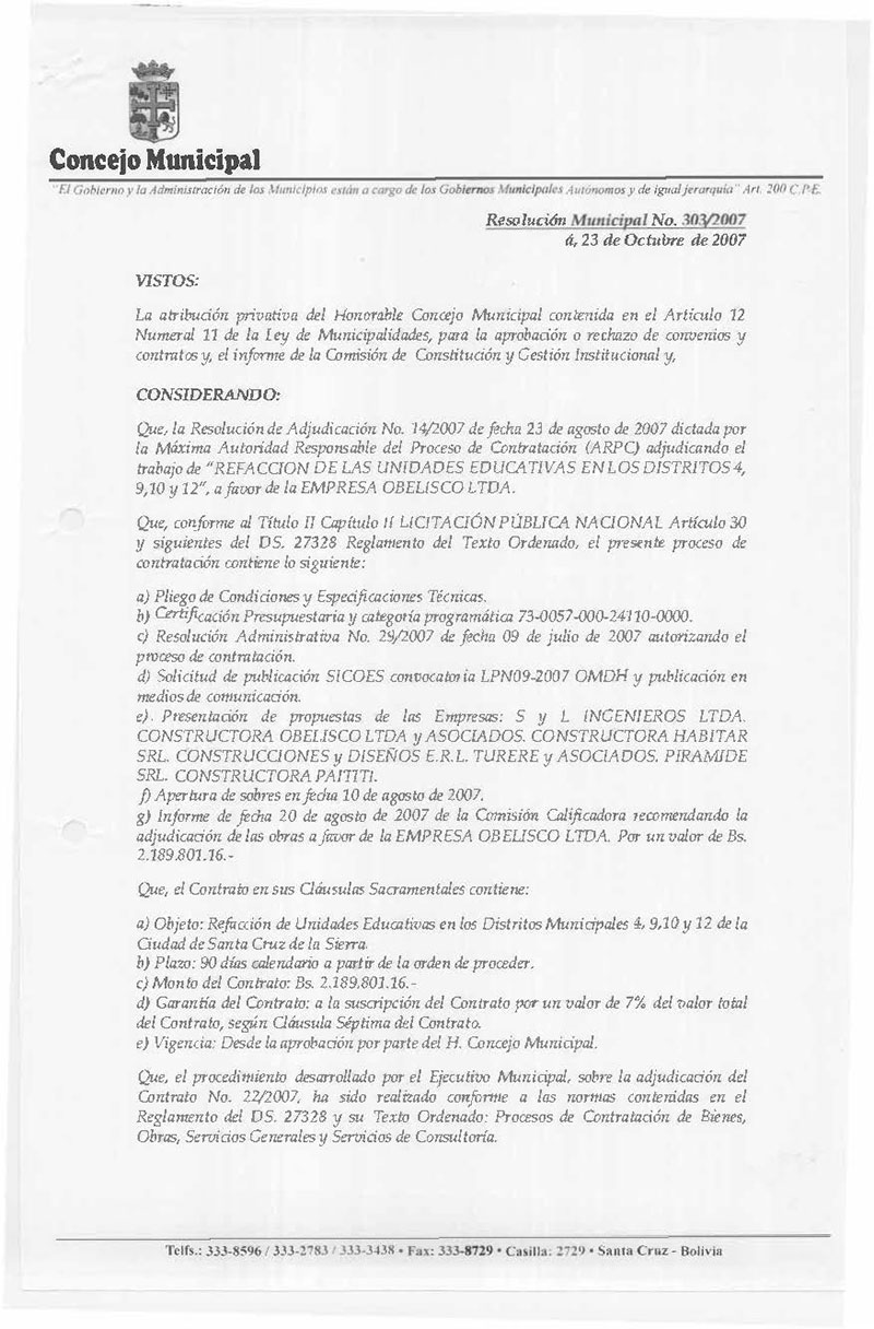 Aprueba el Contrato N° 22/2007 suscrito por el Ejecutivo Municipal para el trabajo de “Refacción de Unidades Educativas en los Distritos Municipales 4, 9, 10 y 12”, con la EMPRESA OBELISCO LTDA, por un valor de Bs. 2.189.801.16 (Dos Millones Ciento Ochenta y Nueve Mil Ochocientos Un 16/100 Bolivianos).