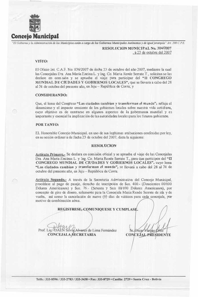 Declara en Comisión Oficial y aprueba el viaje de las Concejales Dra. Ana Maria Encinas y la Ing. Maria René Serrate para participar del "II Congreso Mundial de Ciudades y Gobiernos Locales", en Jeju - República de Corea.