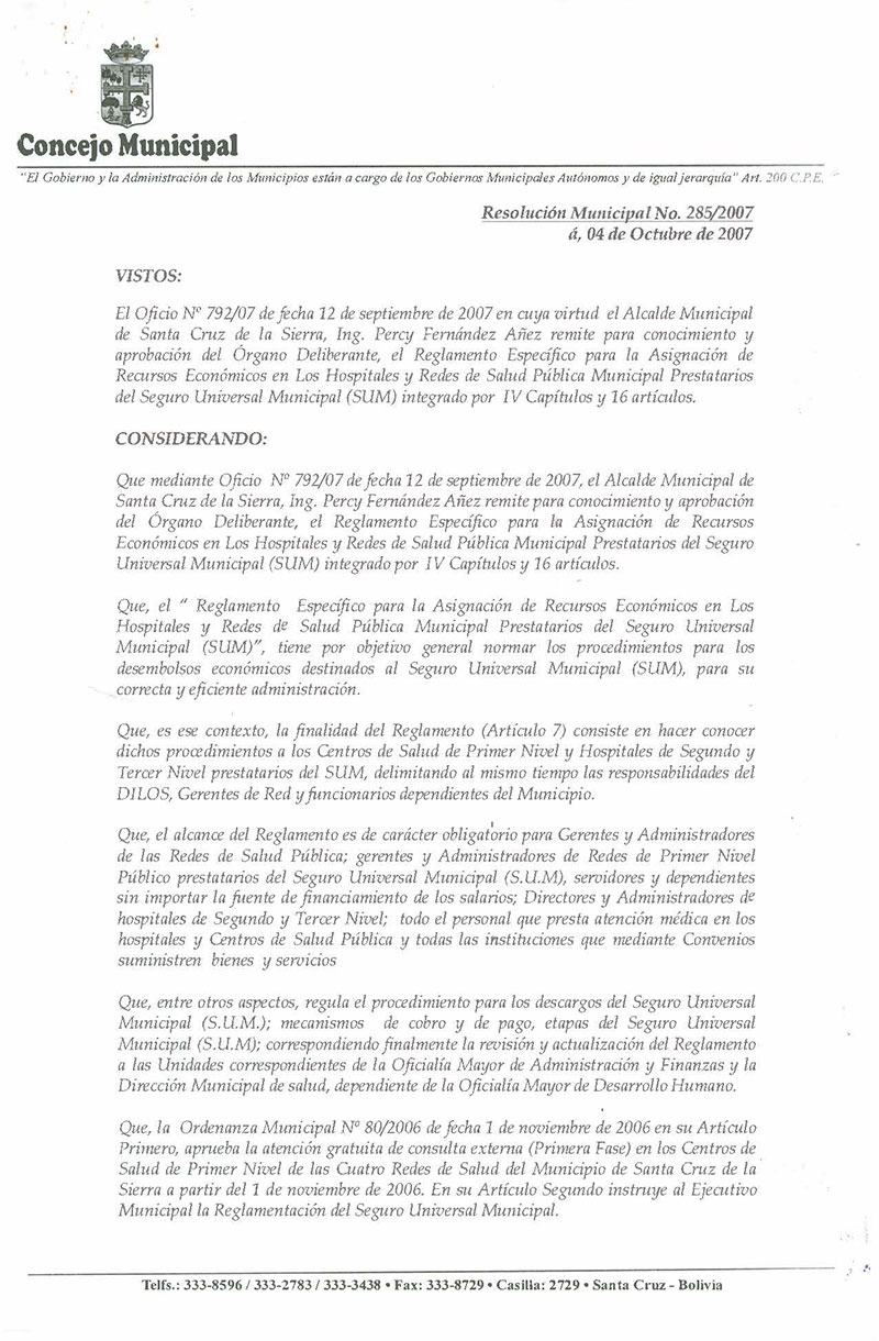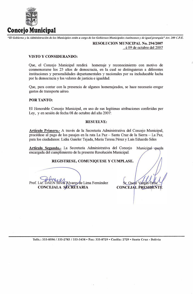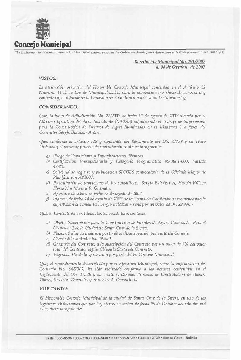 Aprueba el Contrato de la Oficialía Mayor de Planificación N° 64/2007, para el trabajo de “Supervisión Técnica para la Construcción de Fuentes de Agua Iluminadas en la Manzana 1 de la Ciudad de Santa Cruz de la Sierra” suscrito con el Consultor Sergio Balcázar Arana, por un valor de Bs. 29.990.00 (Veintinueve Mil Novecientos noventa 00/100 Bolivianos).