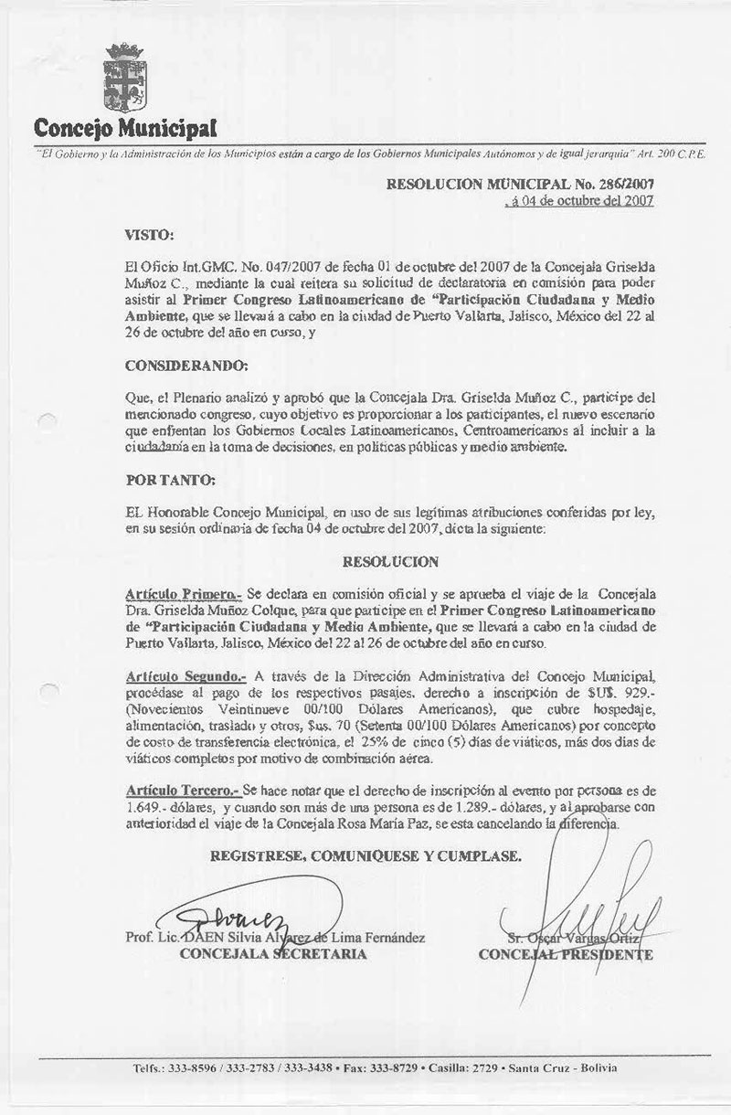 Declara en Comisión Oficial y Aprueba viaje a la Concejal Dra. Griselda Muñoz para participar en EL Primer Congreso Latinoamericano de "Participación Ciudadana y Medio Ambiente"del 22 al 26 de octubre 2007 en Puerto Vallarta, Jalisco de México.