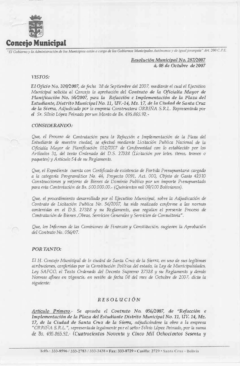 Aprueba el Contrato N° 056/2007, de “Refacción e Implementación de la Plaza del Estudiante Distrito Municipal N°11, UV. 14, Mz. 17, de la Ciudad de Santa Cruz de la Sierra, adjudicada a la empresa “ORRIÑA S.R.L.”, por la suma de Bs. 495.865.92.- (Cuatrocientos Noventa y Cinco Mil Ochocientos Sesenta y Cinco 92/100 Bolivianos).