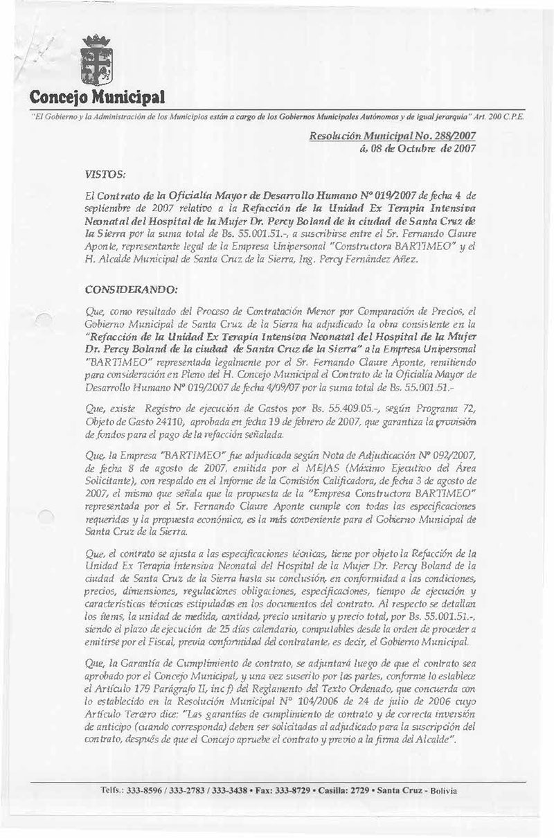 Aprueba el Contrato OMDH Nº 019/2007, relativo a la “Refacción de la Unidad Ex Terapia Intensiva Neonatal del Hospital de la Mujer “Dr. Percy Boland” de la ciudad de Santa Cruz de la Sierra” por la suma total de Bs. 55.001.51.-, (Cincuenta y Cinco mil Uno 51/100) a suscribirse entre con la Empresa Unipersonal “Constructora BARTIMEO”.