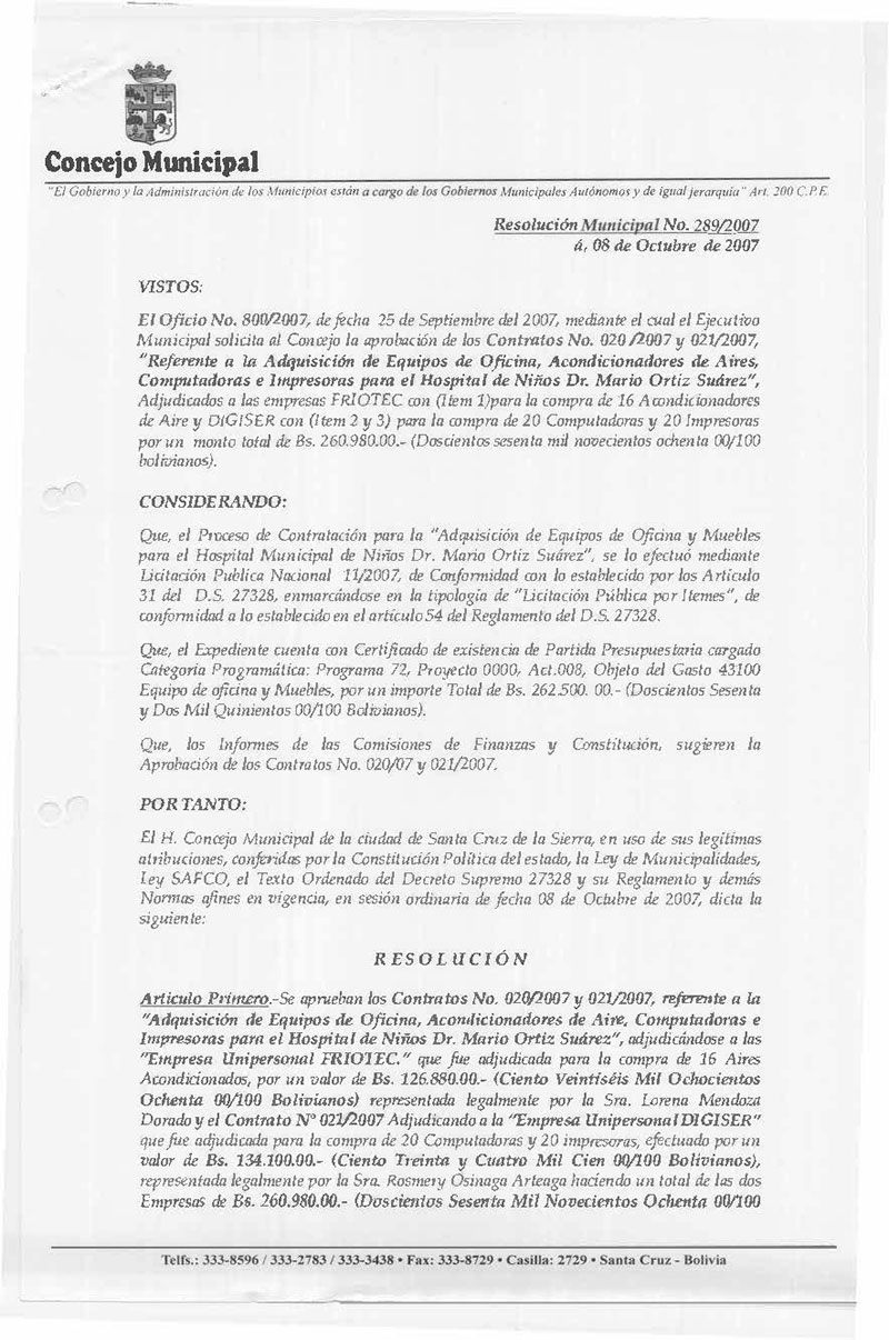 Aprueba los Contratos N° 020/2007 y 021/2007, referente a la “Adquisición de Equipos de Oficina, Acondicionadores de Aire, Computadoras e Impresoras para el Hospital de Niños Dr. Mario Ortiz Suárez”, adjudicada a las “Empresa Unipersonal FRIOTEC.” y la “Empresa Unipersonal DIGISER” por el monto total de Bs. 260.980.00 (Doscientos Sesenta Mil Novecientos Ochenta 00/100 Bolivianos).