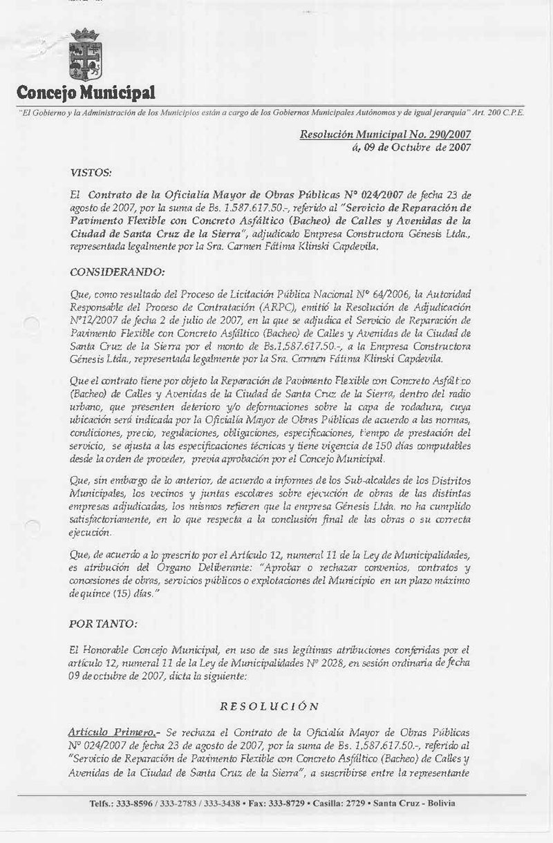 Rechaza el Contrato de la Oficialía Mayor de Obras Públicas N° 024/2007 de fecha 23 de agosto de 2007, por la suma de Bs. 1.587.617.50.-, referido al “Servicio de Reparación de Pavimento Flexible con Concreto Asfáltico (Bacheo) de Calles y Avenidas de la Ciudad de Santa Cruz de la Sierra”, suscrita con la Empresa Constructora Génesis Ltda.