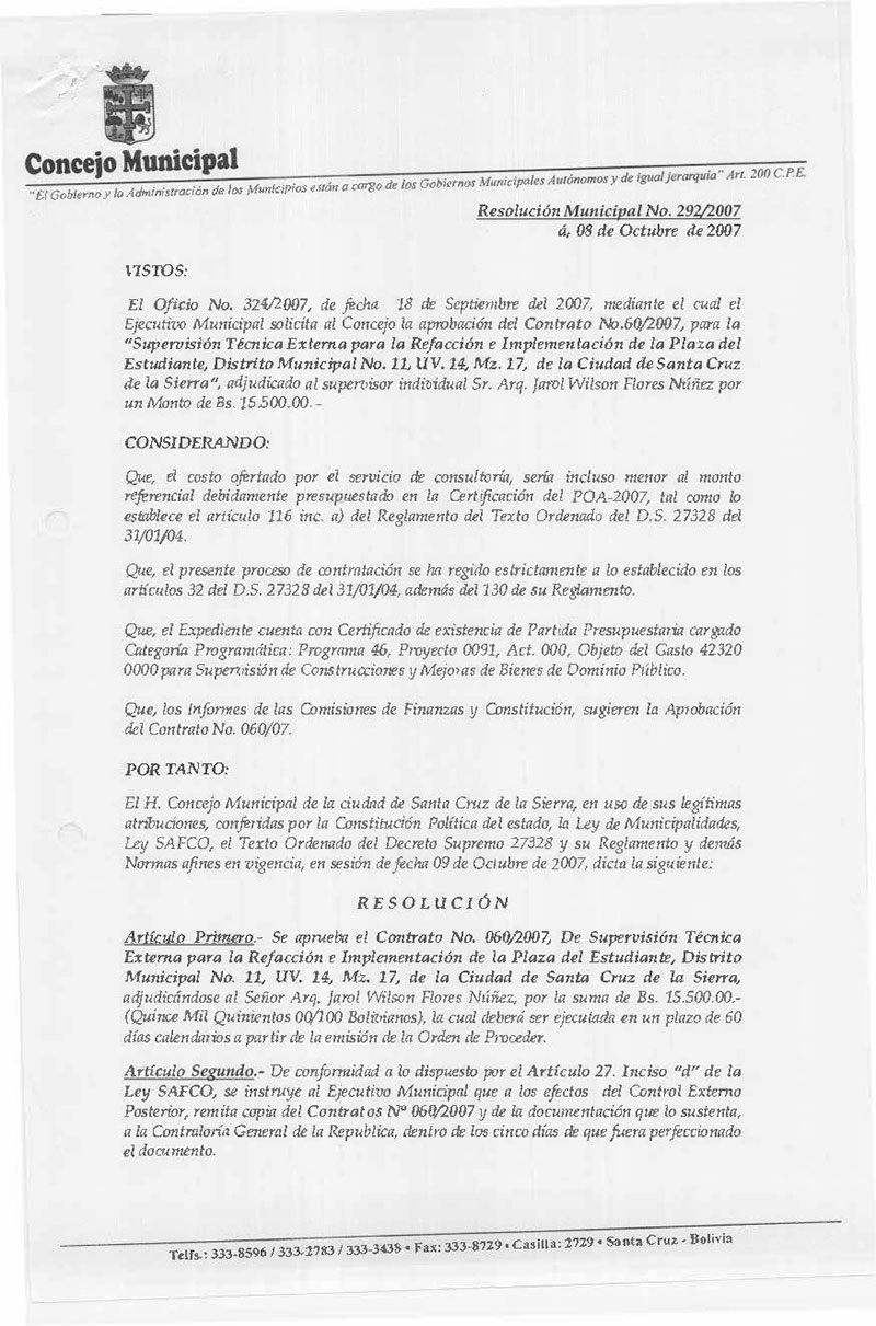 Aprueba el Contrato N° 060/2007, de Supervisión Técnica Externa para la Refacción e Implementación de la Plaza del Estudiante, Distrito Municipal No. 11, UV. 14, Mz. 17, de la Ciudad de Santa Cruz de la Sierra, adjudicada al Señor Arq. Jarol Wilson Flores Núñez, por la suma de Bs. 15.500.00.- (Quince Mil Quinientos 00/100 Bolivianos).