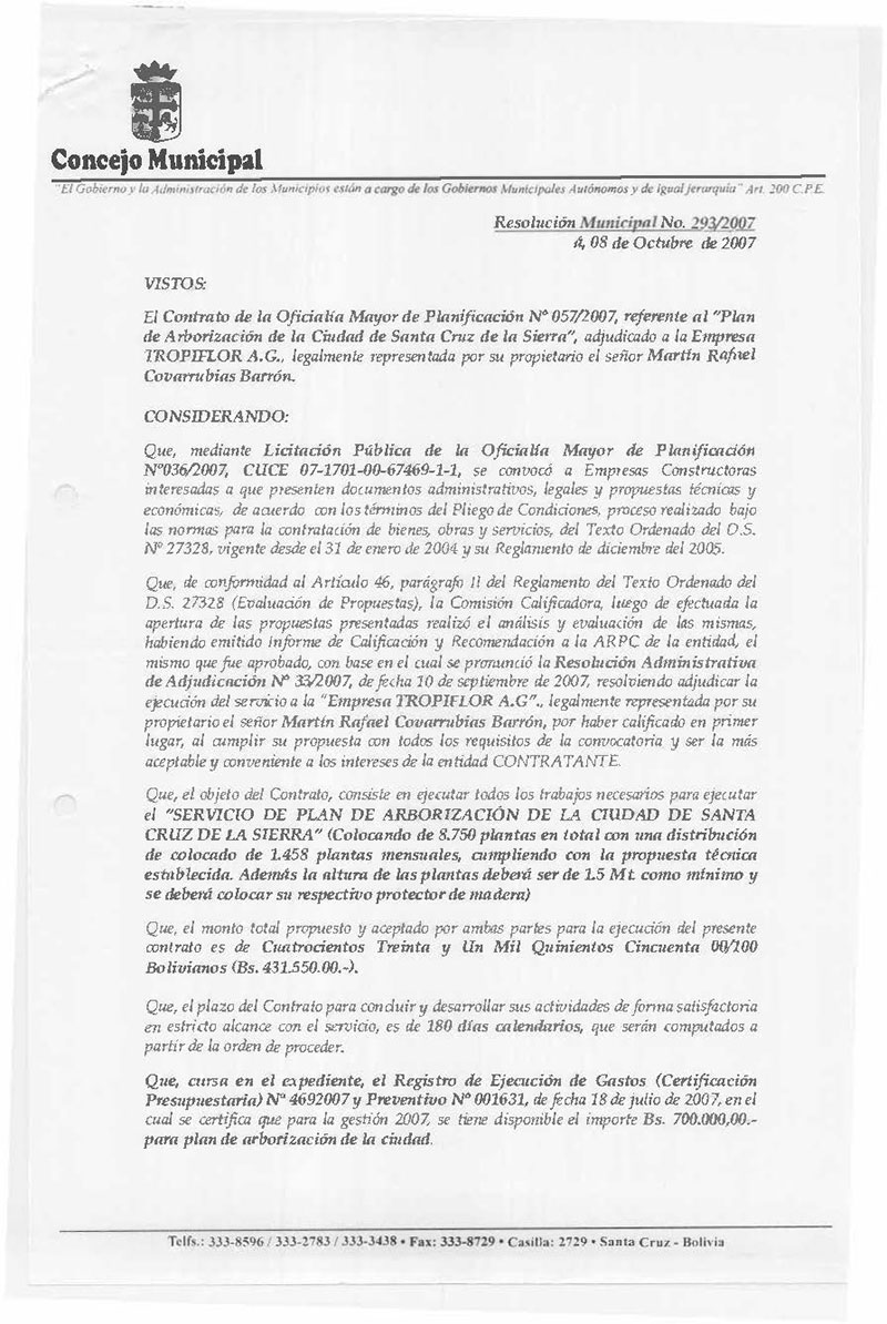 Aprueba el Contrato Nº 057/2007, referente al “Plan de Arborización de la Ciudad de Santa Cruz de la Sierra”, adjudicado a la Empresa TROPIFLOR A.G., por un monto total de Bs. 431.550.00 (Cuatrocientos Treinta y Un Mil Quinientos Cincuenta 00/100 Bolivianos).