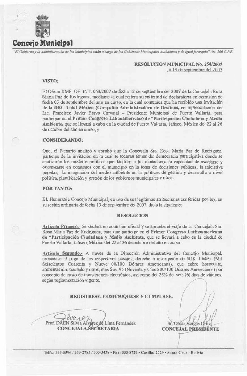 Declara en Comisión Oficial y Aprueba viaje de la Concejala Rosa Mría Paz de Rodríguez, para participan en el Primer Congreso Latinoamericano de "Participación Ciudadana y Medio Ambiente" en Puerto Vallarta, Jalisco México.