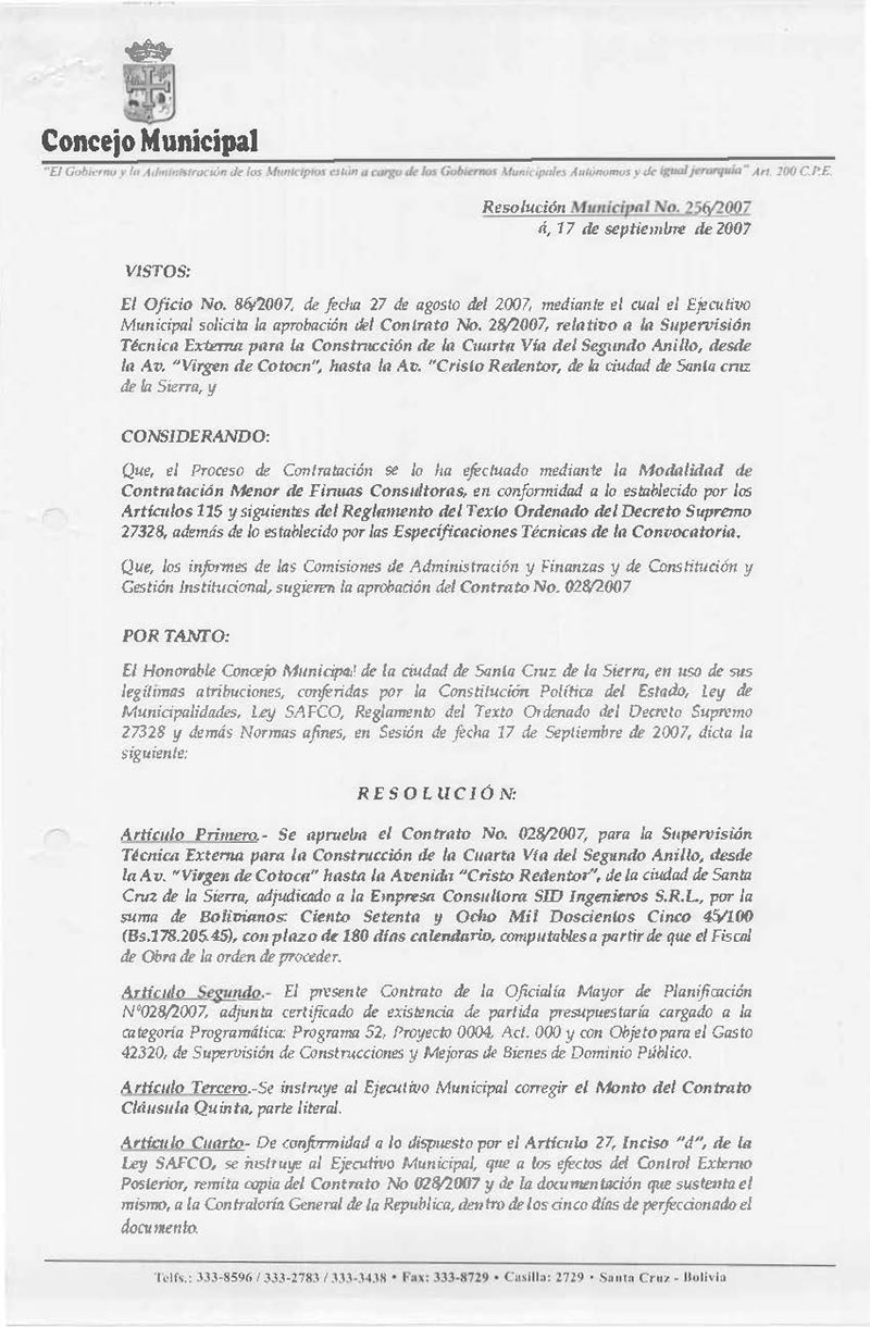 Aprueba el Contrato N° 028/2007, para la Supervisión Técnica Externa para la Construcción de la Cuarta Vía del Segundo Anillo, desde la Av. “Virgen de Cotoca” hasta la Avenida “Cristo Redentor”, de la ciudad de Santa Cruz de la Sierra, adjudicado a la Empresa Consultora SID Ingenieros S.R.L., por la suma de Bs.178.205.45.- (Ciento Setenta y Ocho Mil Doscientos Cinco 45/100 Bolivianos).