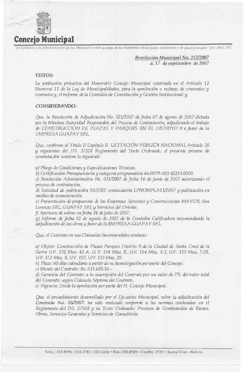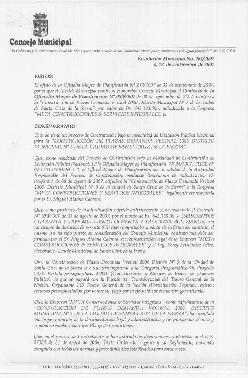 Aprueba el Contrato N° 50/2007, relativo a la “CONSTRUCCIÓN DE PLAZAS DEMANDA VECINAL 2006, DISTRITO MUNICIPAL Nº 3 DE LA CIUDAD DE SANTA CRUZ DE LA SIERRA” por el valor de Bs. 643.183.00.-, (SEISCIENTOS CUARENTA Y TRES MIL CIENTO OCHENTA Y TRES 00/100 BOLIVIANOS), adjudicado a la empresa “META CONSTRUCCIONES.