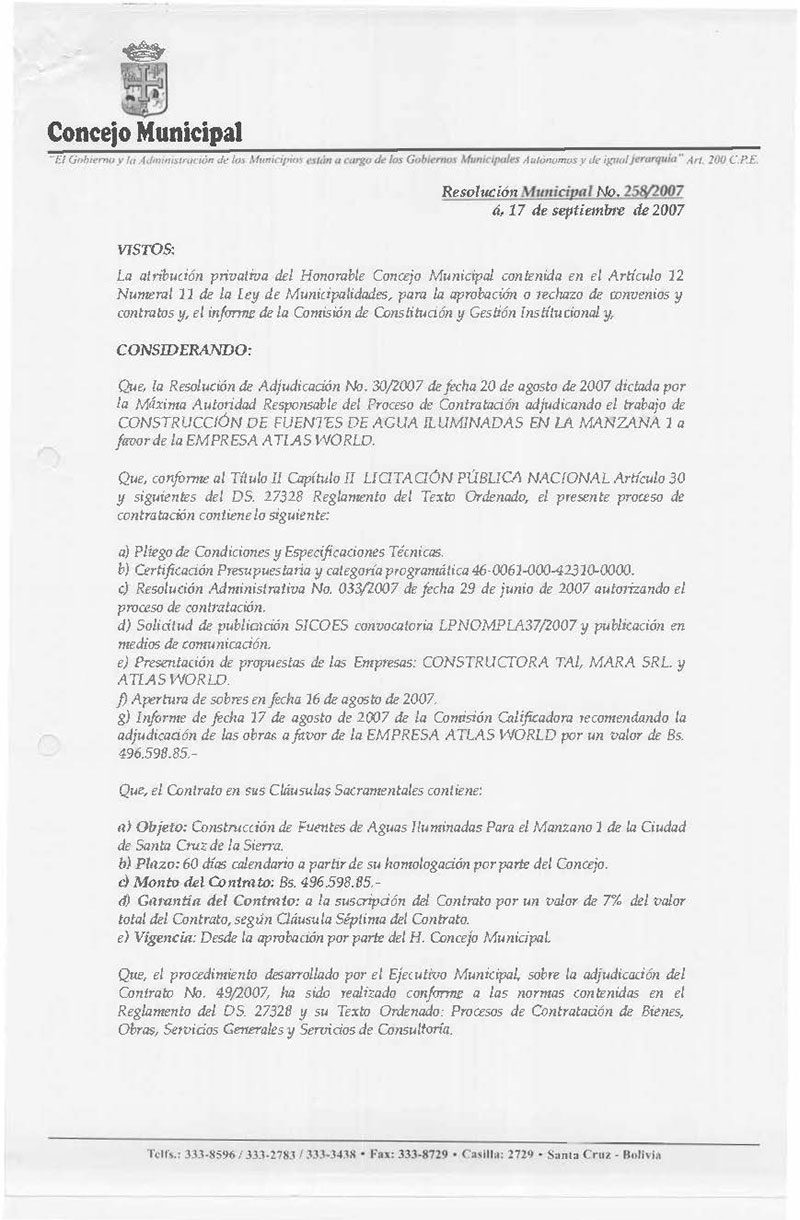 Aprueba el Contrato N° 49/2007, para el trabajo de CONSTRUCCIÓN DE FUENTES DE AGUAS ILUMINADAS EN LA MANZANA 1 DE LA CIUDAD DE SANTA CRUZ DE LA SIERRA, suscrita con la EMPRESA ATLAS WORLD suscrito por el Ejecutivo Municipal , por un valor de .Bs. 496.598.85 (Cuatrocientos Noventa y Séis Mil Quinientos Noventa y Ocho).