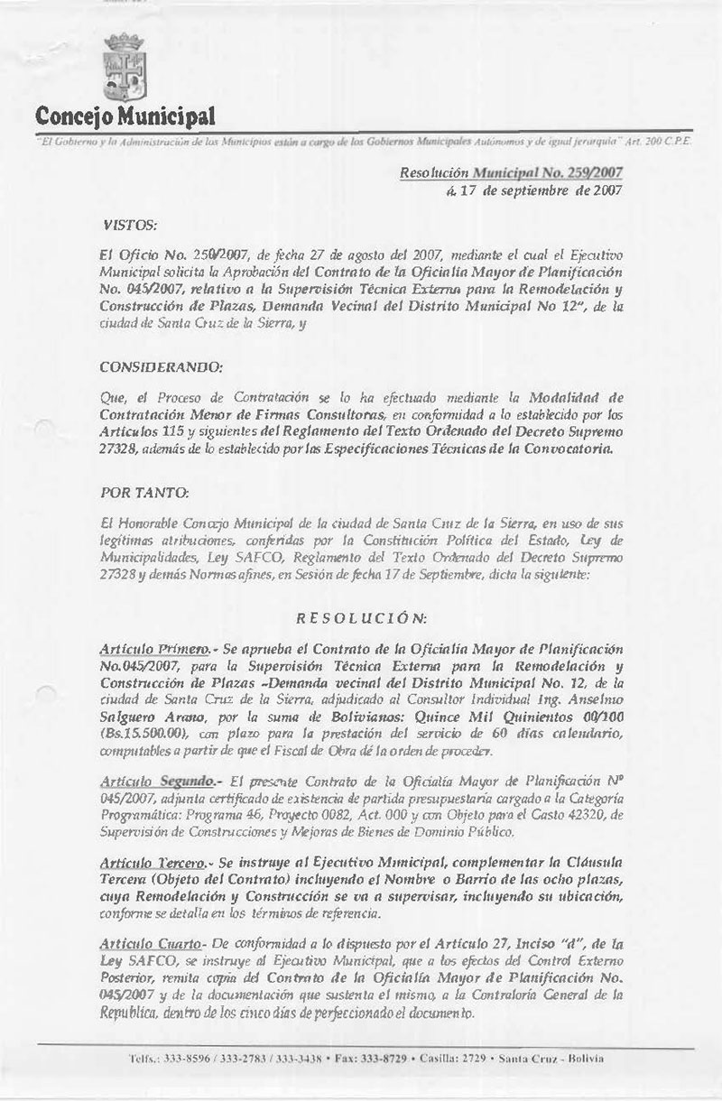 Aprueba el Contrato de la Oficialía Mayor de Planificación No.045/2007, para la Supervisión Técnica Externa para la Remodelación y Construcción de Plazas – Demanda vecinal del Distrito Municipal N° 12, de la ciudad de Santa Cruz de la Sierra, adjudicado al Consultor Individual Ing. Anselmo Salguero Arano, por la suma de Bs. 15.500.00 (Quince Mil Quinientos 00/100 Bolivianos).