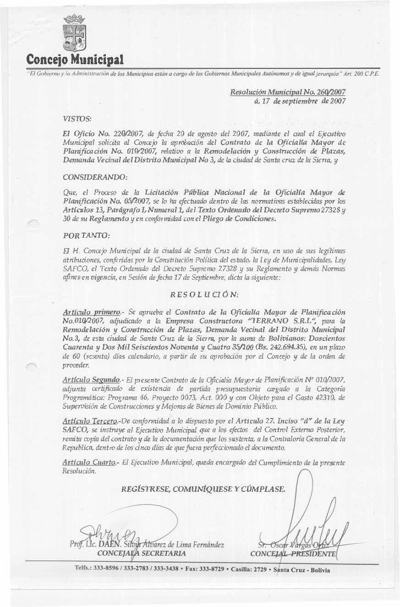 Aprueba el Contrato Oficialía Mayor de Planificación N° 10/2007, para la Remodelación y Construcción de Plazas - Demanda Vecinal del Distrito Municipal N° 3, de esta ciudad de Santa Cruz de la Sierra, adjudicado a la Empresa Constructora “TERRANO S.R.L”, por la suma de Bs. 242.694.35 (Doscientos Cuarenta y Dos Mil Seiscientos Noventa y Cuatro 35/100 Bolivianos).