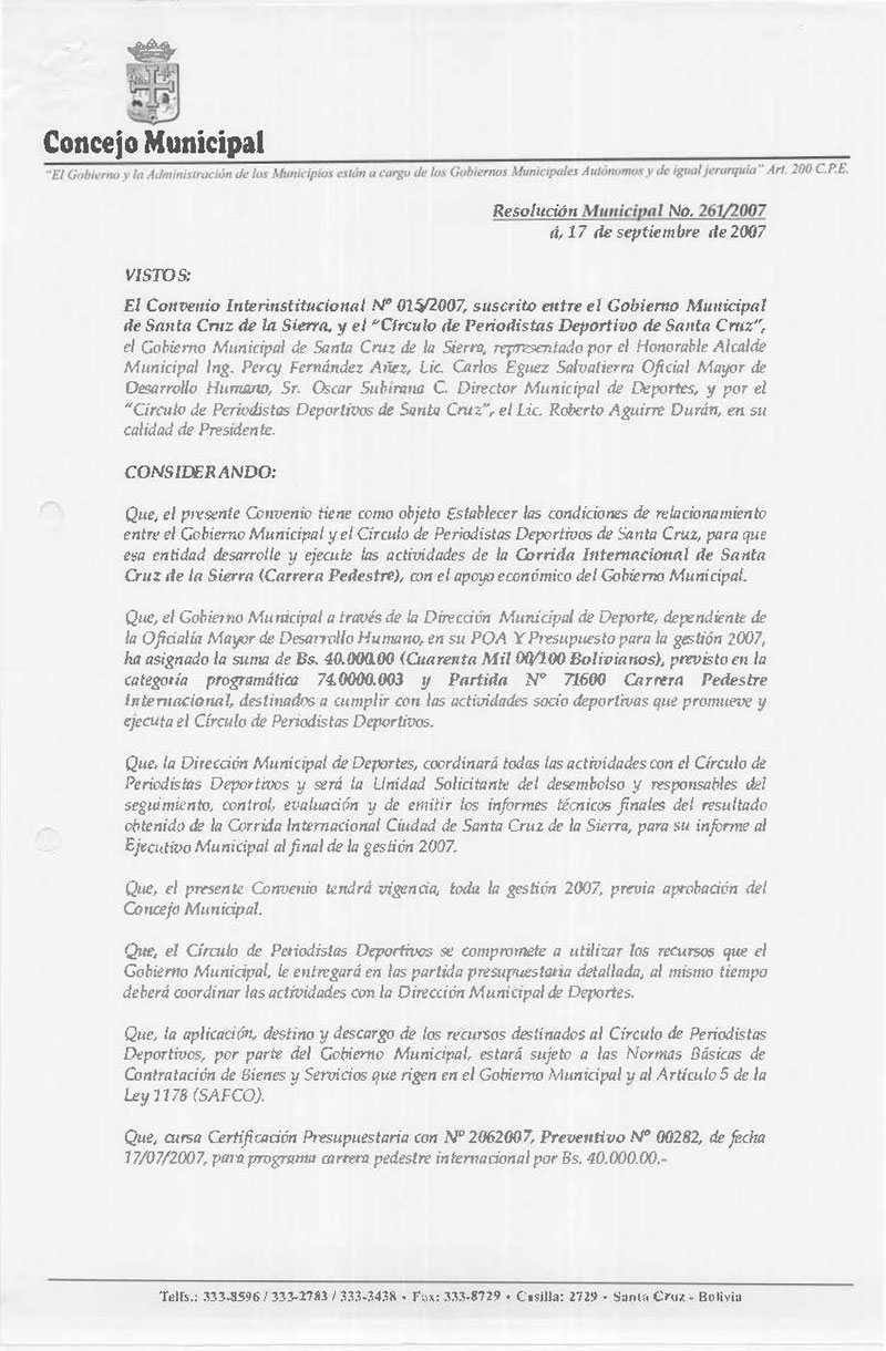 Aprueba el Convenio Interinstitucional Nº 015/2007, Suscrito entre el Gobierno Municipal de Santa Cruz de la Sierra y el “Círculo de Periodistas Deportivos Santa Cruz”.