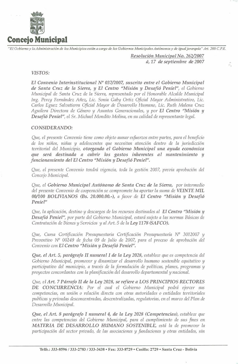 Se aprueba el Convenio Interinstitucional Nº 037/2007, suscrito entre el Gobierno Municipal de Santa Cruz de la Sierra, y el Centro “Misión Y Desafió Peniel”, suscrito el 9 de Agosto del 2007.