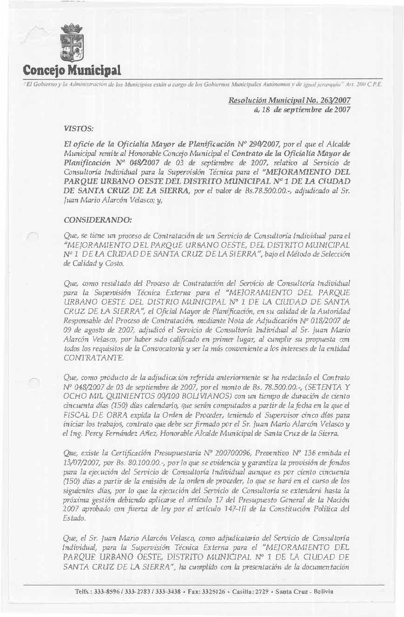 Aprueba el Contrato de la Oficialía Mayor de Planificación N° 048/2007, relativo al Servicio de Consultoría Individual, para la Supervisión Técnica Externa para el “MEJORAMIENTO DEL PARQUE URBANO OESTE DEL DISTRITO MUNICIPAL Nº 1 DE LA CIUDAD DE SANTA CRUZ DE LA SIERRA”, por el valor de Bs. 78.500.00.-, (SETENTA Y OCHO MIL QUINIENTOS 00/100 BOLIVIANOS).