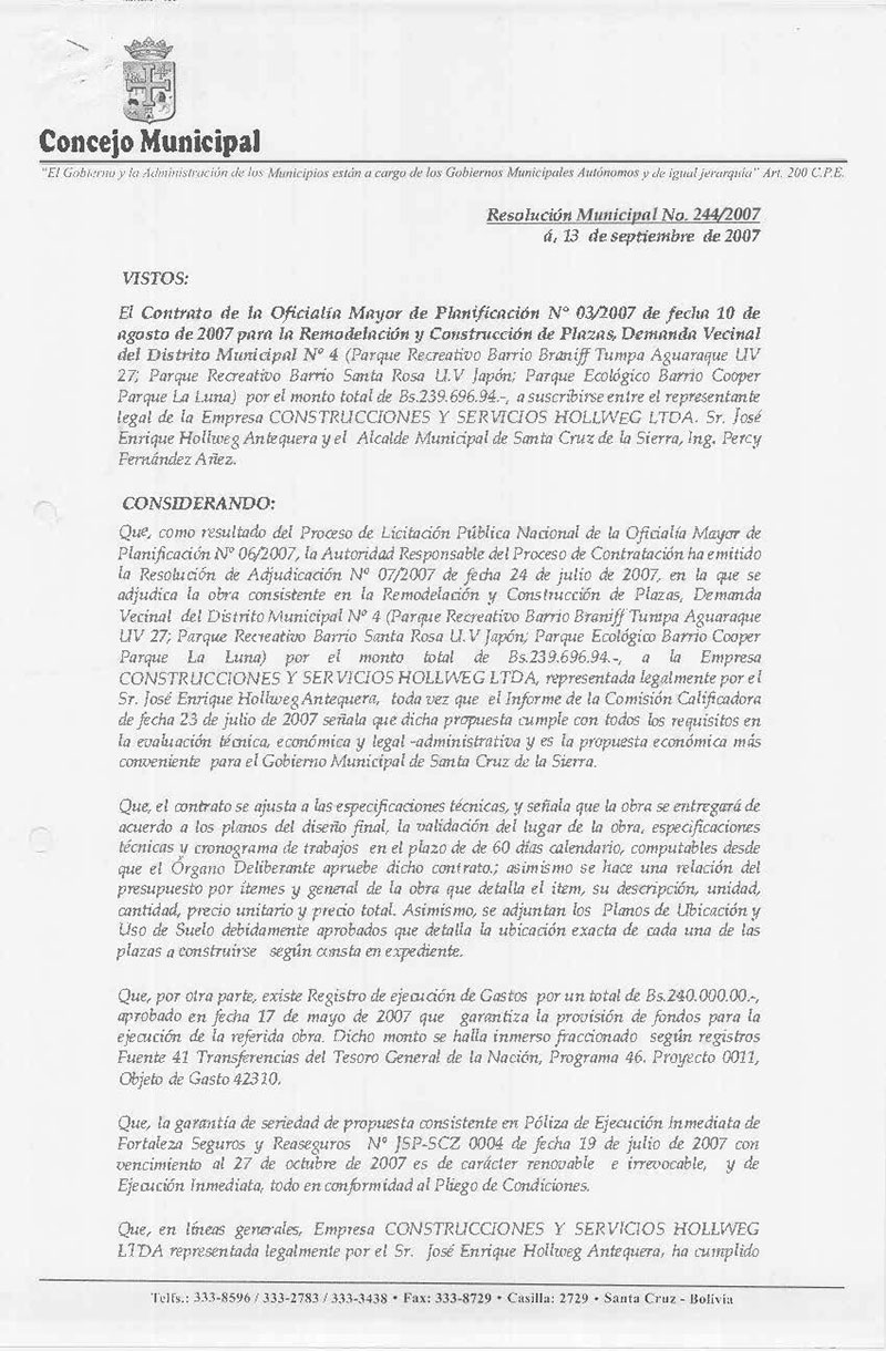 Aprueba el Contrato de la Oficialía Mayor de Planificación N° 03/2007, para la Remodelación y Construcción de Plazas, Demanda Vecinal del Distrito Municipal Nº 4 (Parque Recreativo Barrio Braniff Tumpa Aguaraque UV 27; Parque Recreativo Barrio Santa Rosa U.V Japón; Parque Ecológico Barrio Cooper Parque La Luna), por el monto total de Bs.239.696.94.- (Doscientos Treinta y Nueve Mil Seiscientos Noventa y Seis 94/100 Bolivianos), suscrita con la Empresa CONSTRUCCIONES Y SERVICIOS HOLLWEG LTDA.