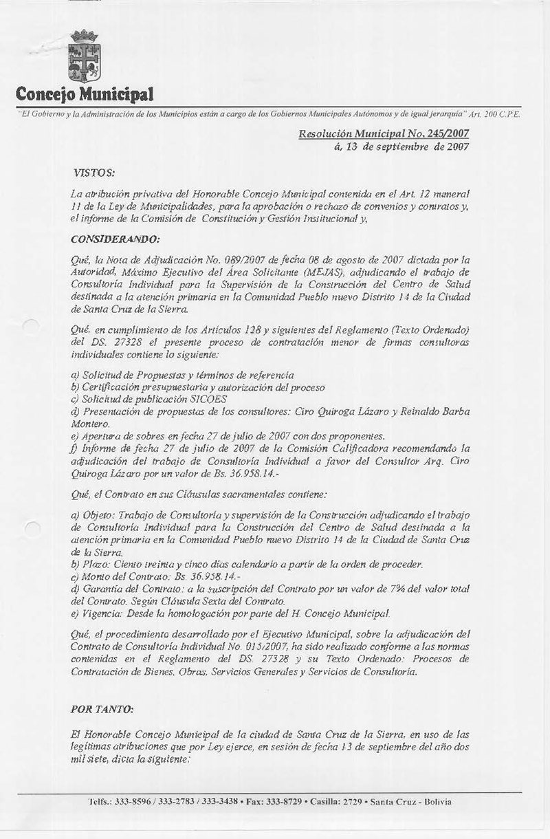 Aprueba el Contrato de Consultoría Individual N° 015/2007, para la realización del Trabajo de Consultoría de supervisión sobre la Construcción del Centro de Salud para la atención primaria en la Comunidad Pueblo Nuevo del Distrito Municipal 14 de la Ciudad de Santa Cruz de la Sierra, suscrito con el Consultor Arq. Ciro Néctor Quiroga Lázaro, por un monto de Bs. 36.958.14 .- (Treinta y Seis Mil Novecientos Cincuenta y OCho 14/100 Bolivianos).