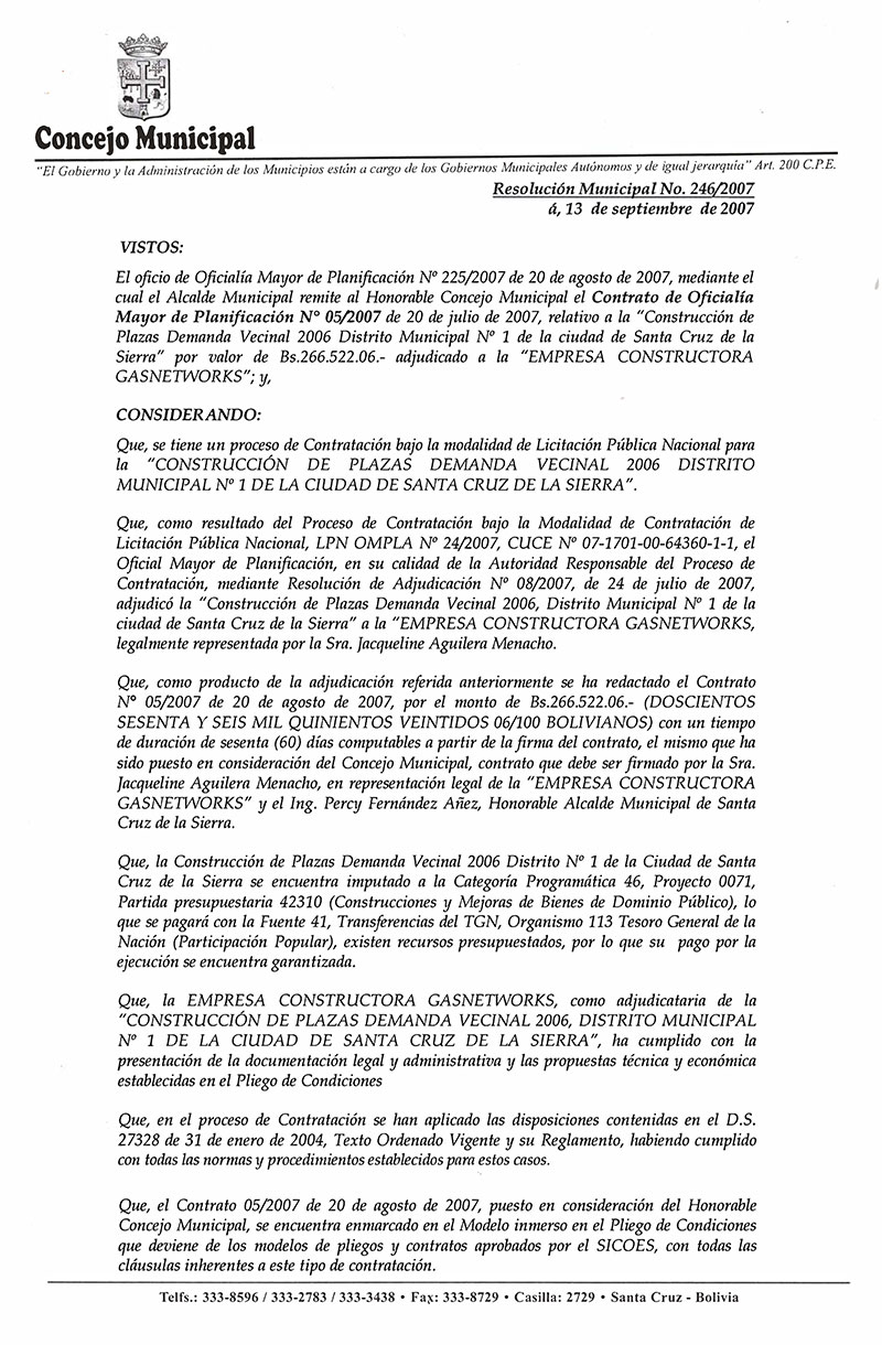 Aprueba el Contrato OMPLA N° 05/2007 de 20 de agosto de 2007, por el valor de Bs. 266.522.06 (DOSCIENTOS SESENTA Y SEIS MIL QUINIENTOS VEINTIDÓS 06/100 BOLIVIANOS), relativo a la “CONSTRUCCIÓN DE PLAZAS DEMANDA VECINAL 2006 DISTRITO MUNICIPAL Nº 1 DE LA CIUDAD DE SANTA CRUZ DE LA SIERRA”, adjudicado a la “EMPRESA CONSTRUCTORA GASNETWORKS”.
