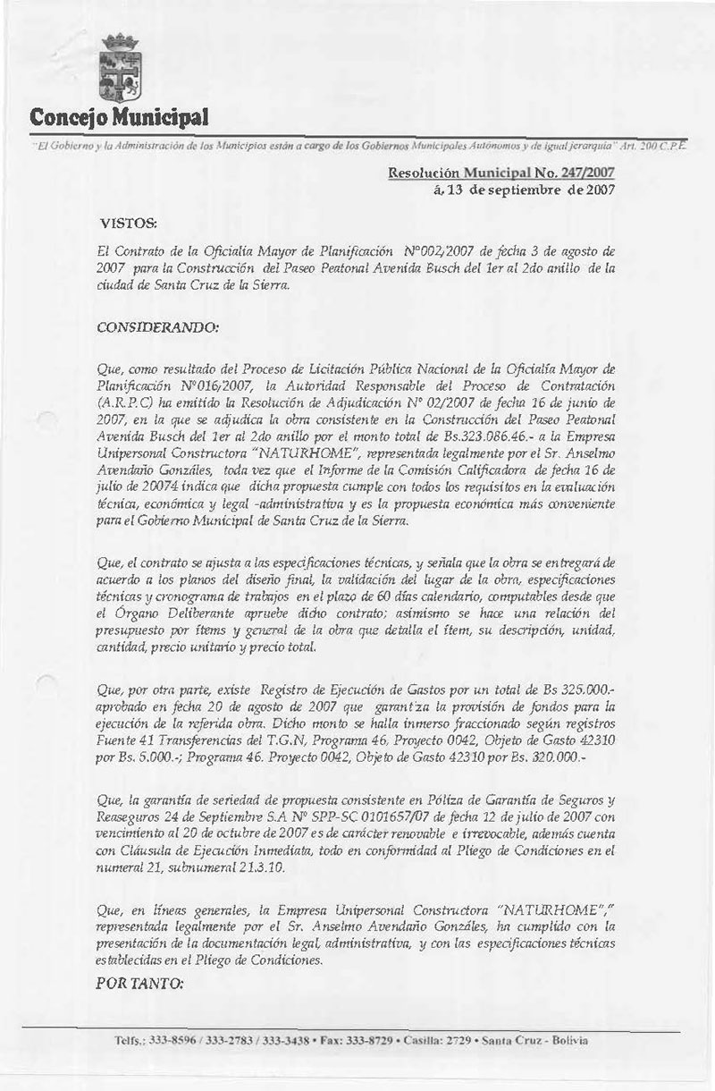 Aprueba el Contrato de la Oficialia Mayor de Planificación N°002/2007, para la Construcción del Paseo Peatonal Avenida Busch del 1er al 2do anillo, por el monto total de Bs. 323.086.46.-(Trescientos Veintitrés mil Ochenta y seis 46/100 Bolivianos) a suscribirse con la Empresa Unipersonal Constructora “NATURHOME”.